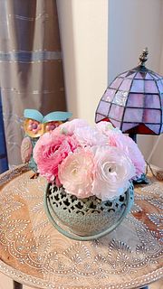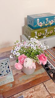 色んなピンクの可愛らしいブーケです。色も大きさもバランスが良いです。 ラナンキュラス大好きなので、前を通るたびに幸せな気分になります♪