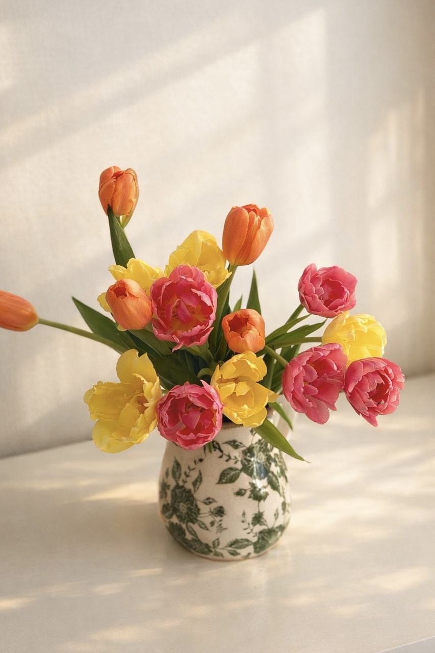 今回は3品種ミックスでお届けします。どんなチューリップが届くかは、箱を開けるまでのお楽しみ。長く楽しめるよう、硬いつぼみの状態でお届けしていることも。水揚げするとふっくら色づきますのでご安心ください。