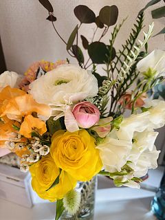 シークレットなのでどんなブーケがくるか楽しみに待ってました!オレンジ系の花束、ラナンキュラスとスイートピーがメイン、その他たくさん入っていてとってもボリュームがありました⭐︎ユーカリ、スターチスなどドライにできるものも多くて長く楽しめそうです♪