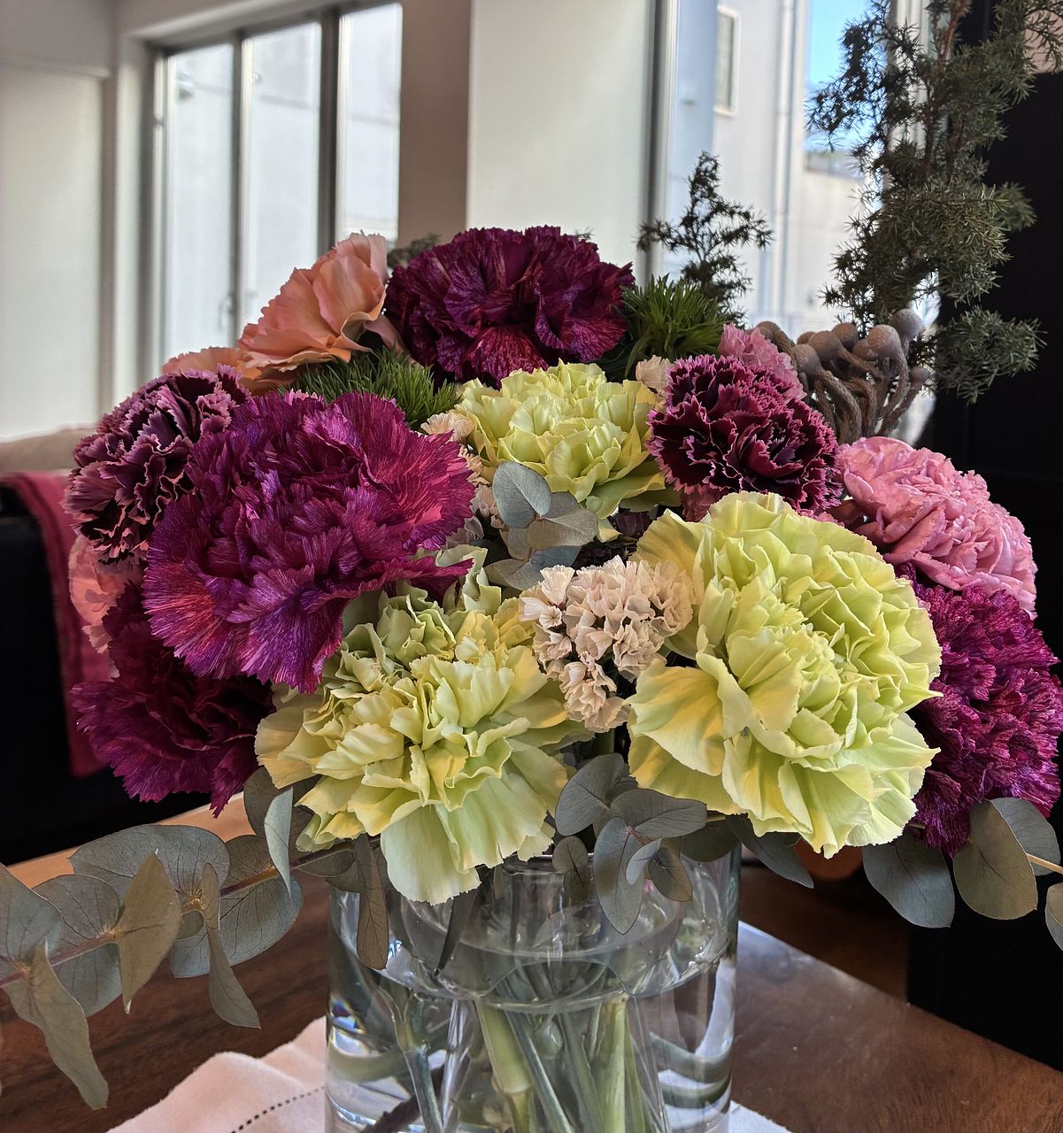 フリルのような花びらのカーネーションをたっぷりと束ねました🍓🍫