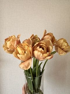 お花屋さんで見た時、高額だったので 買うのを戸惑ったんですがやっぱり欲しかったと 思ってたらフラワーさんで見つけて、即買いしました。何とも言えないセピア色の素敵なチューリップです。