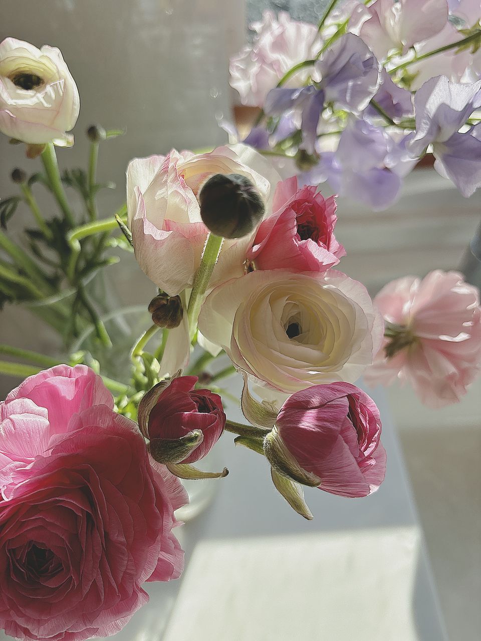 濃淡のバラエティ豊かなピンクのラナンキュラスをたっぷり束ねて。