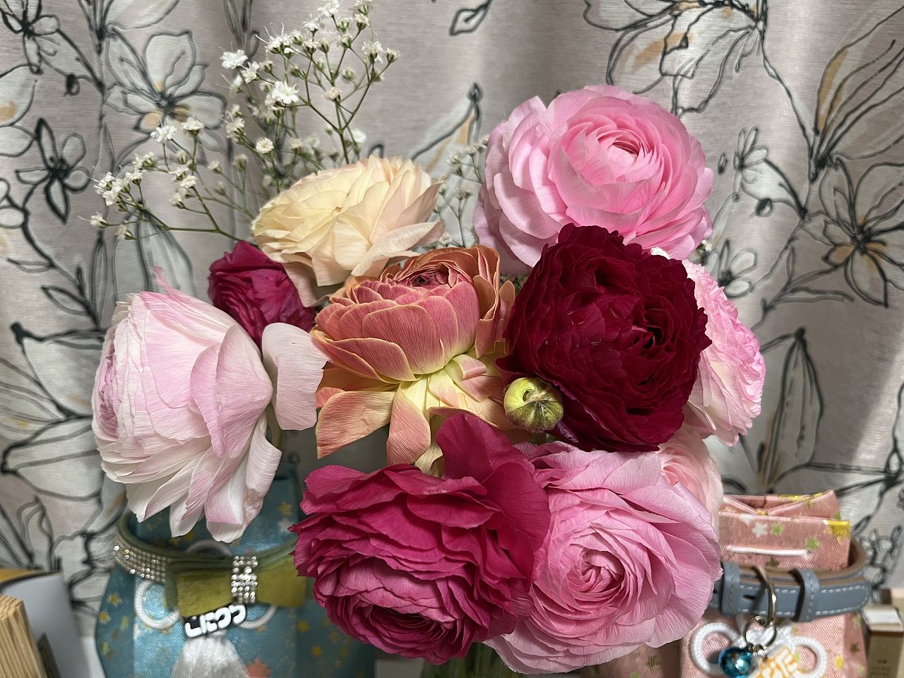 薄いピンク、濃いピンク、白にピンク縁どり、クリーム色などとても可愛いラナンキュラスでした!1本少し折れているものがありましたが、真ん中に生けて他の花で支えてもらうとなんとか耐えてました。まだ12本綺麗に咲いてます。つぼみも咲いてくれるといいなぁ。 →1週間経って、4本萎れたり花びらが落ちたりしました。6本くらいはまだまだ満開に咲いています。つぼみは難しそう。近所の花屋さんで少し買い足そうかな。芍薬の季節が楽しみです。