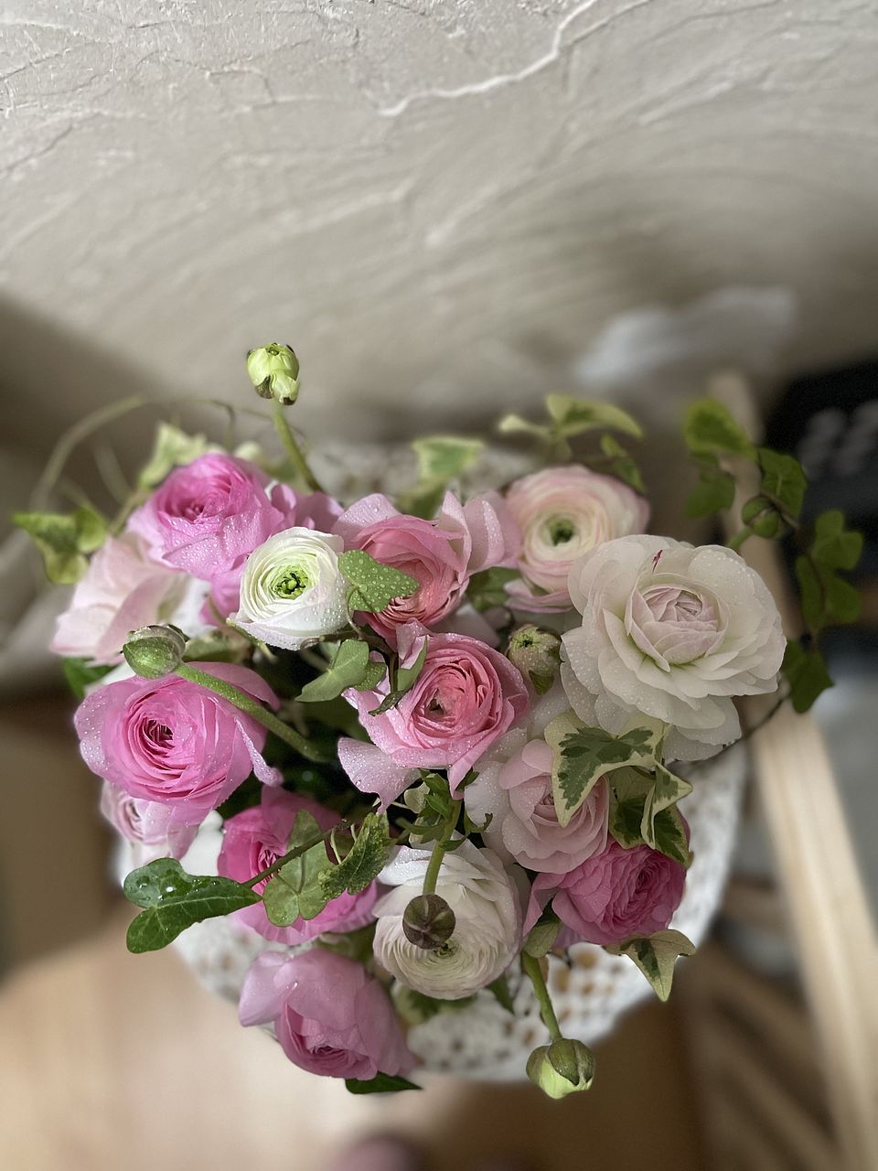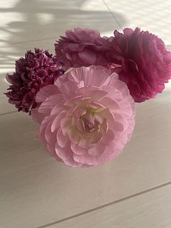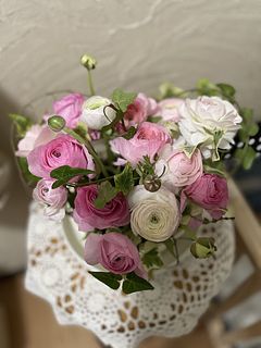 色んなピンクの可愛らしいブーケです。色も大きさもバランスが良いです。 ラナンキュラス大好きなので、前を通るたびに幸せな気分になります♪