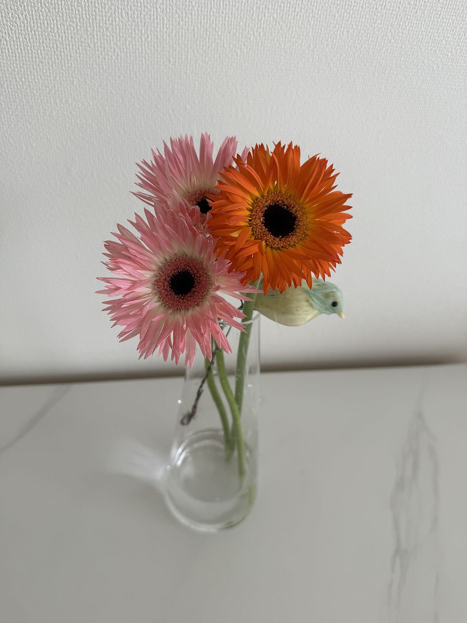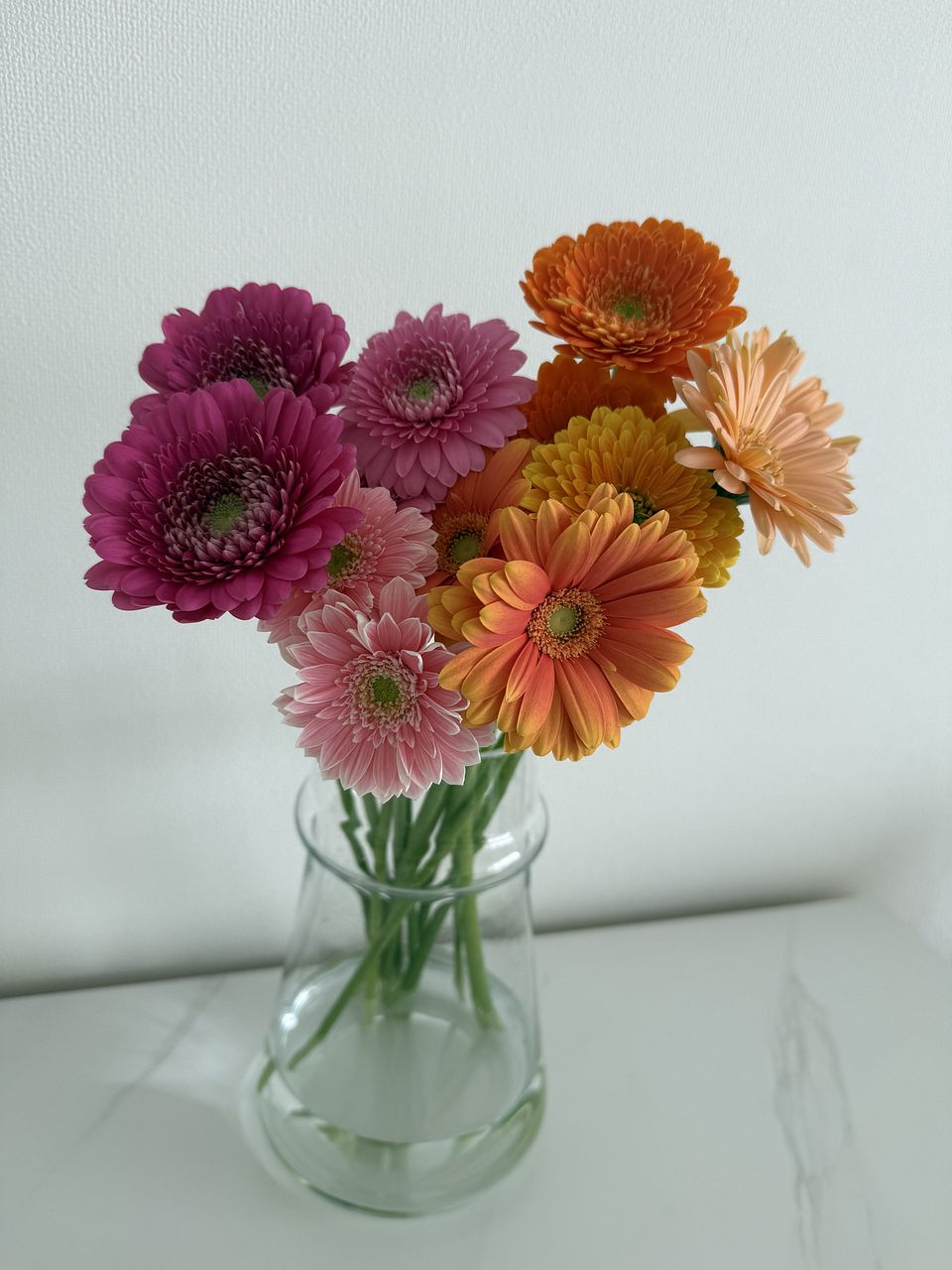 フリンジのようなスパイダー咲き、ポンポン咲きなど珍しい咲き方のガーベラもお入れして、ピンクレッド系とオレンジイエロー系のアソートで1束ずつ、合計15〜16本ほどお届けします🍋
