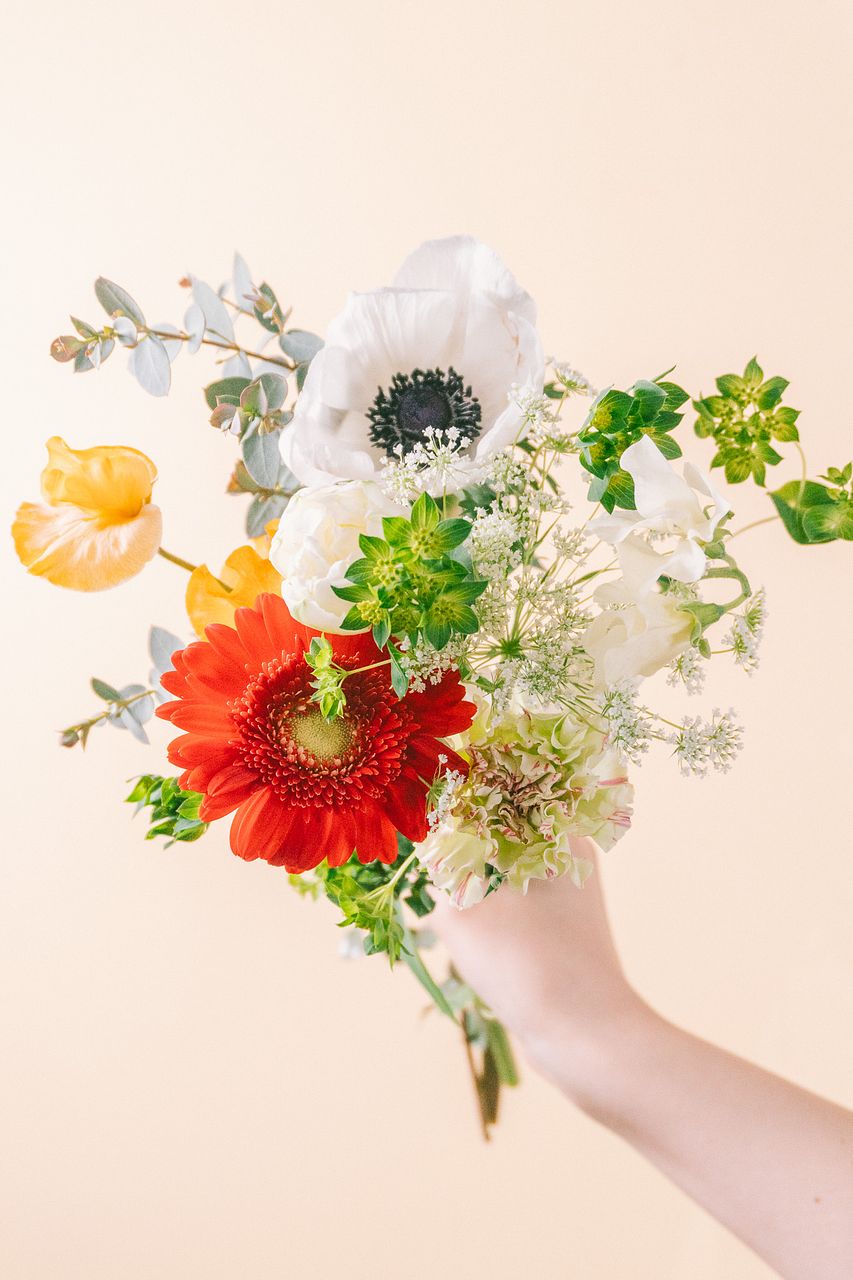 ビタミンカラーの花に、白ややさしいグリーンを重ねて、軽やかで清潔感のある表情に仕上げました🍽️