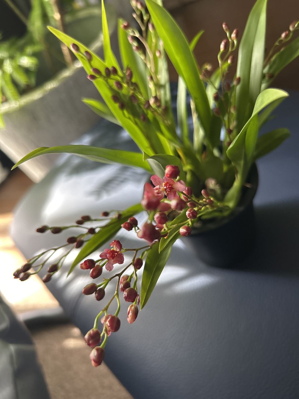 小さな花が連なり、幻想的に舞うような姿が印象的なオンシジウム「レッドファンタジー」🧚