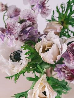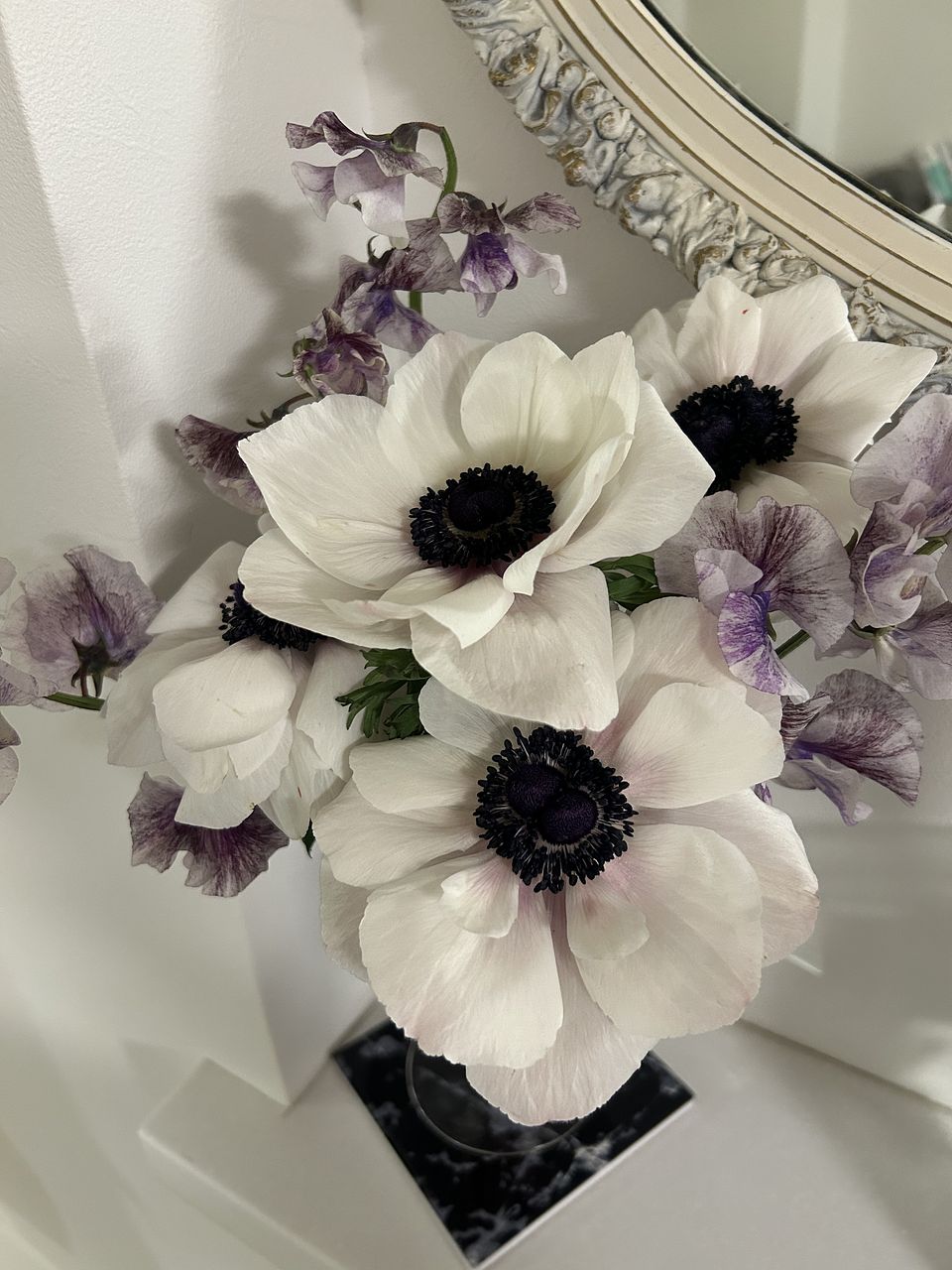 珍しいホワイトのアネモネ「ホワイトブラックセンター」と絞り染めのようなカラーリングが美しいスイートピー「詩かすみ」を贅沢に束ねて🦋