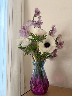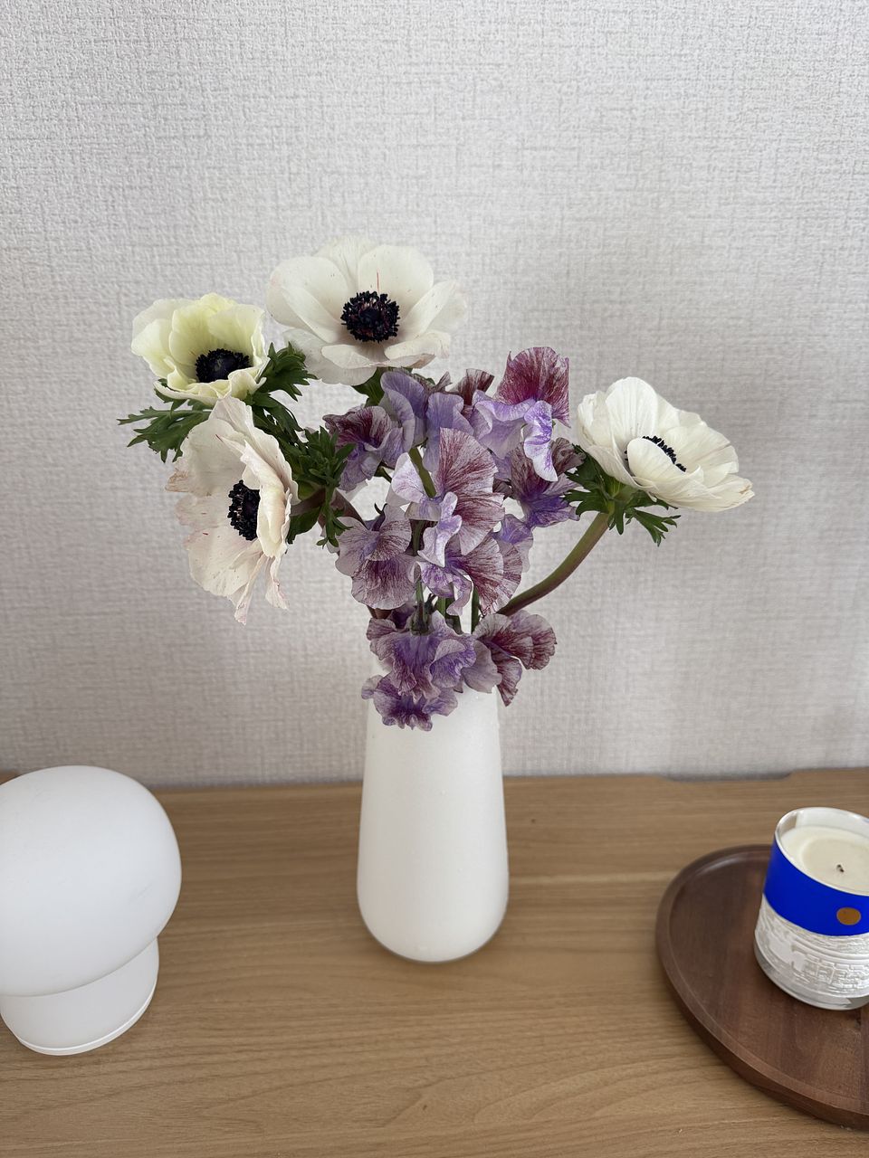 届いた時は花は閉じていましたが、水切りをして飾ってまもなく、アネモネが綺麗に開いて存在感たっぷりでした。 淡い紫色のスイートピーとアネモネの白、可愛い茎の緑が綺麗でした!