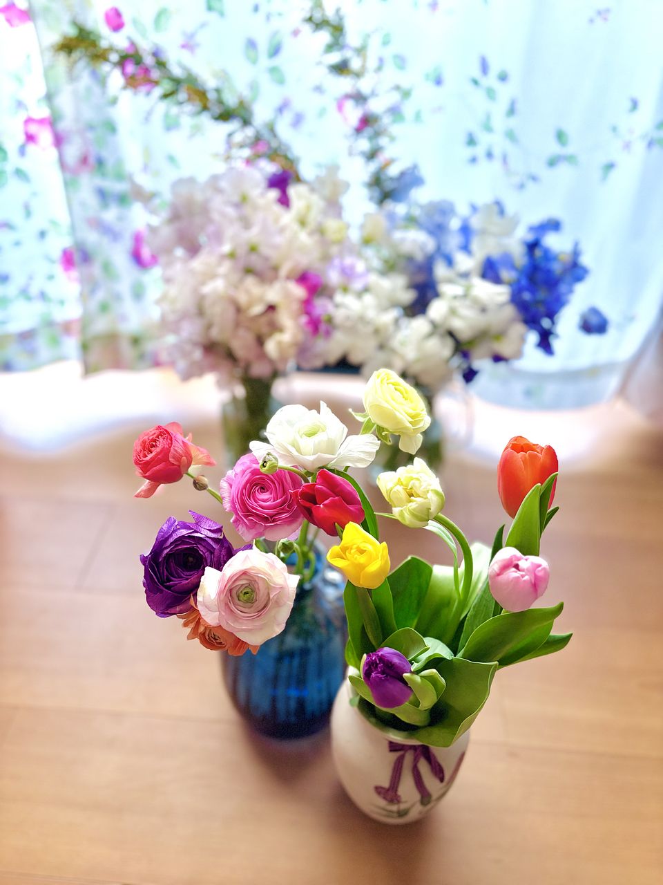 大好きなラナンキュラスが出るのを待ってました!チューリップも種類か混ざっていて可愛いです。カラフルな組み合わせで、見る度に明るい気持ちになります。