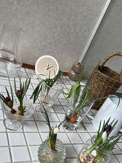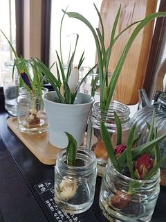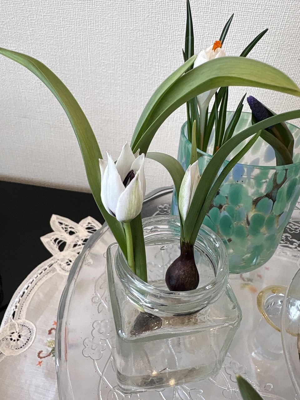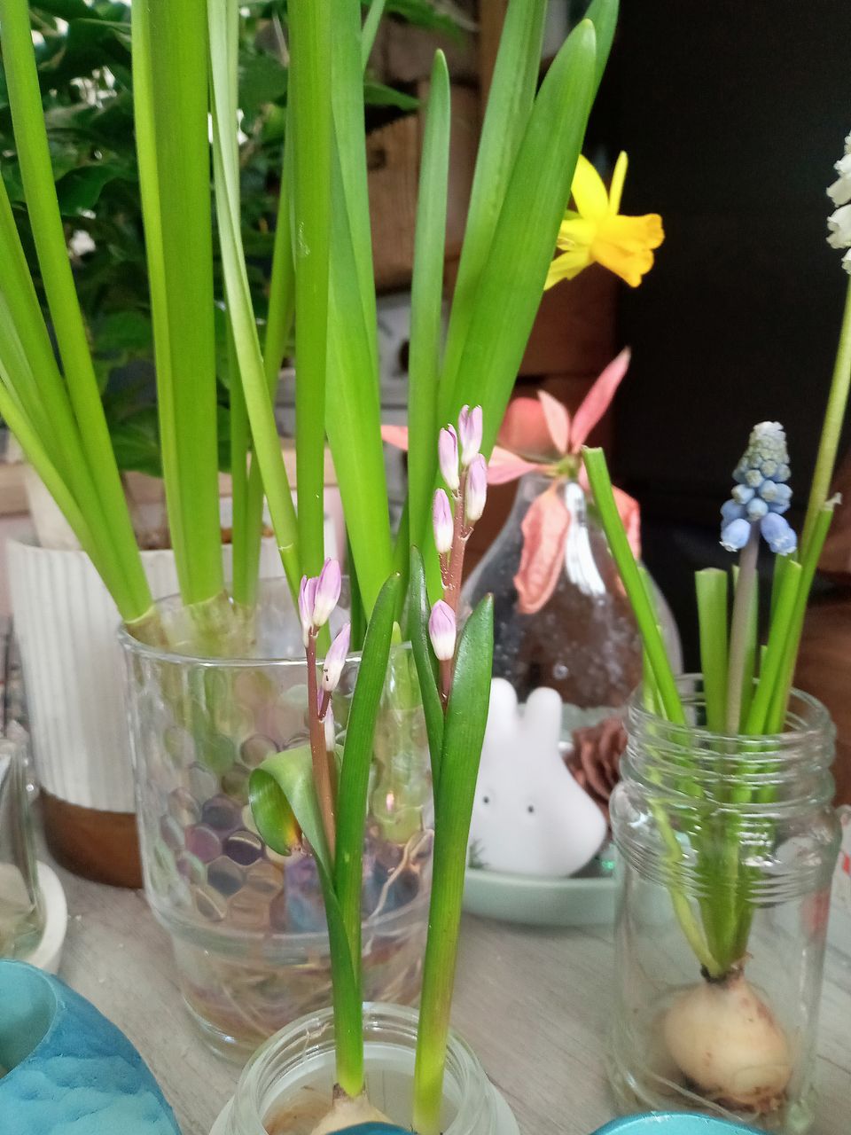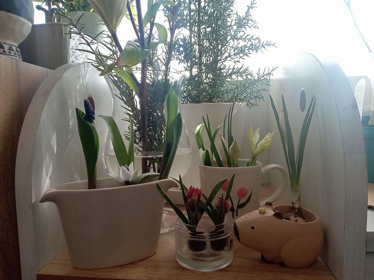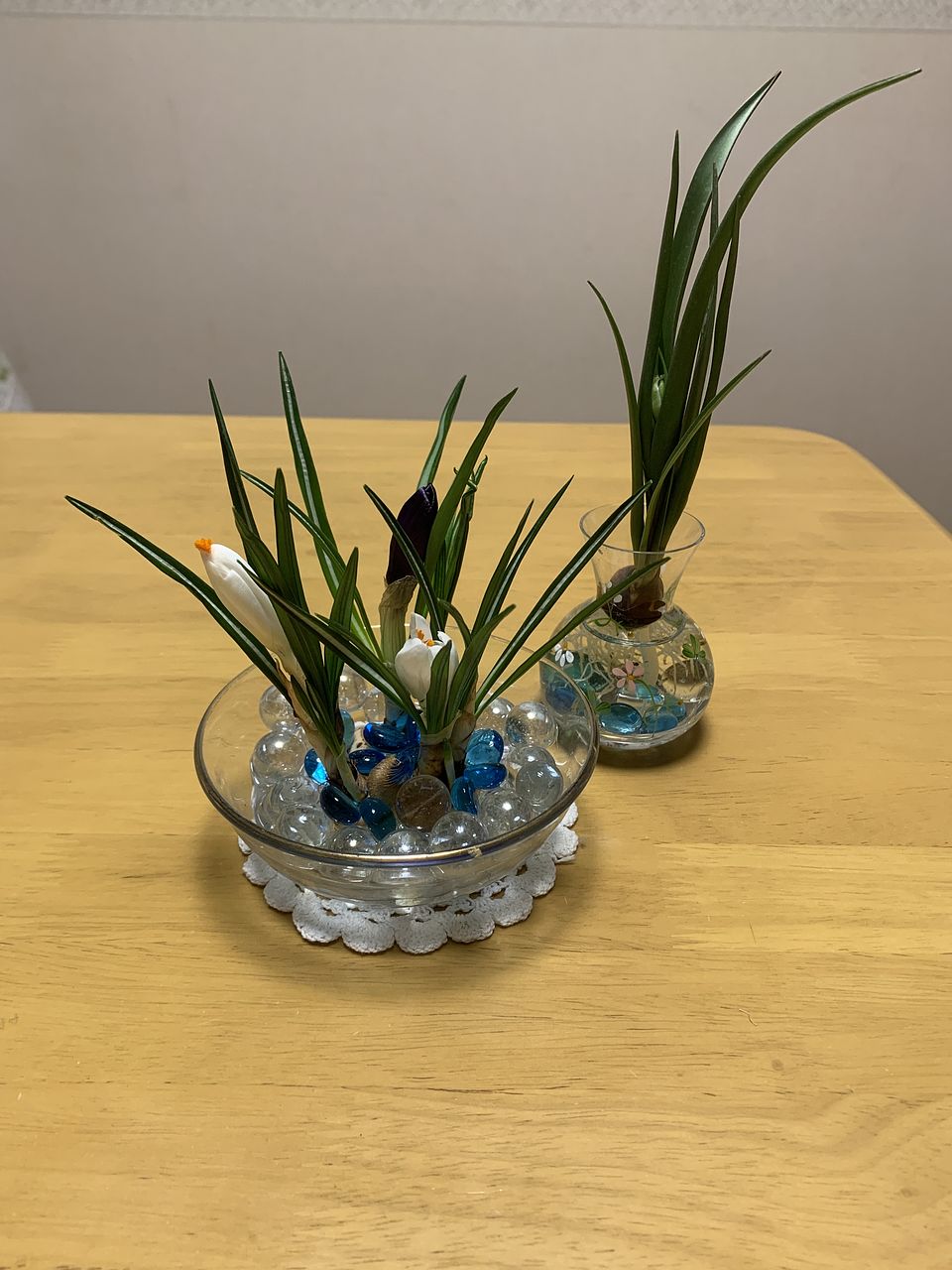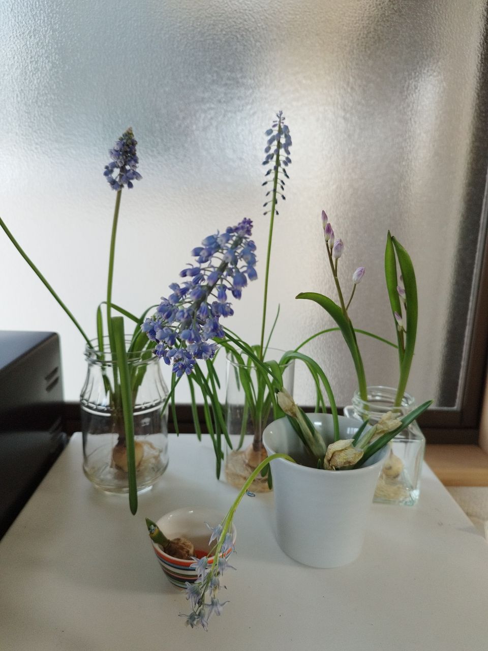水仙、青いムスカリは早々に咲き始め、水仙は1週間ほど楽しめました。青ムスカリはきれいに咲き続けています。アイリスのような花が2つありましたが、花開く前に枯れてしまいました。その他、3個ほど根が腐ったり、葉が黄変してだめになりました。