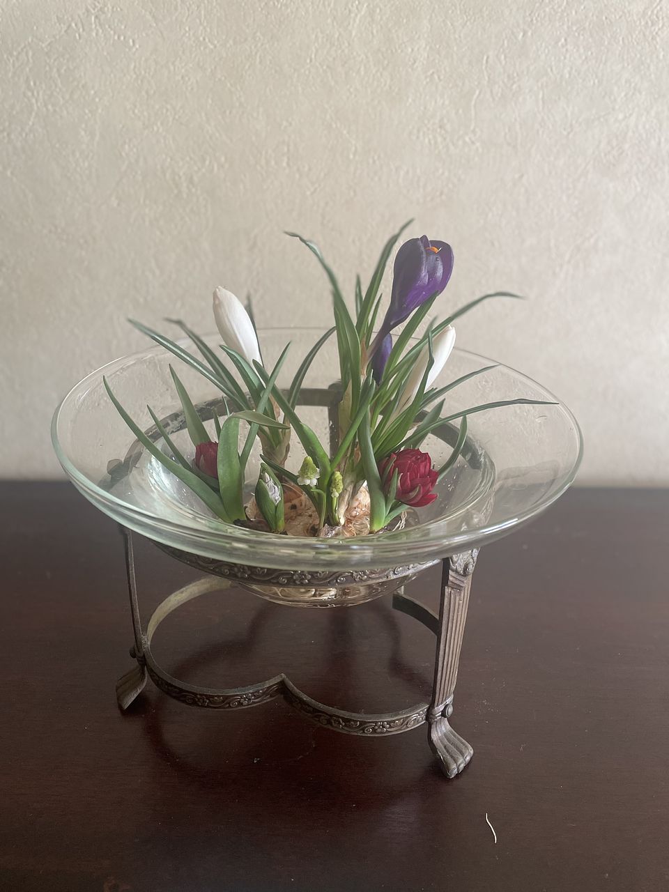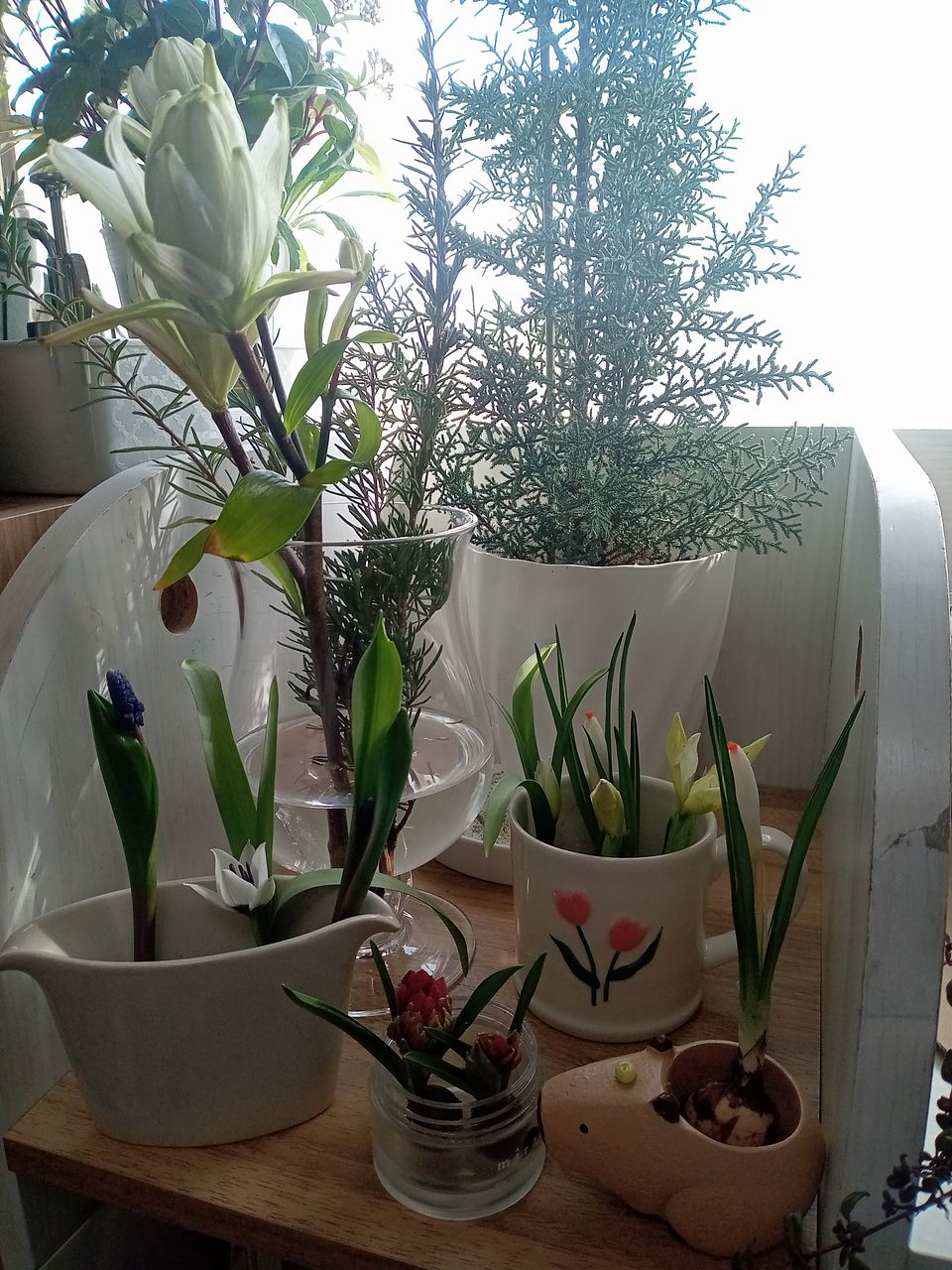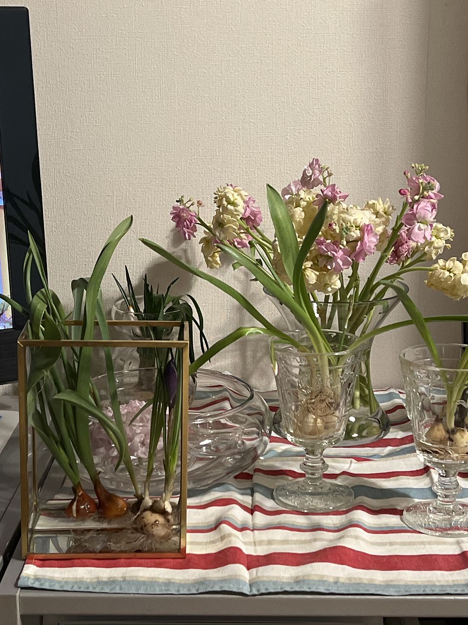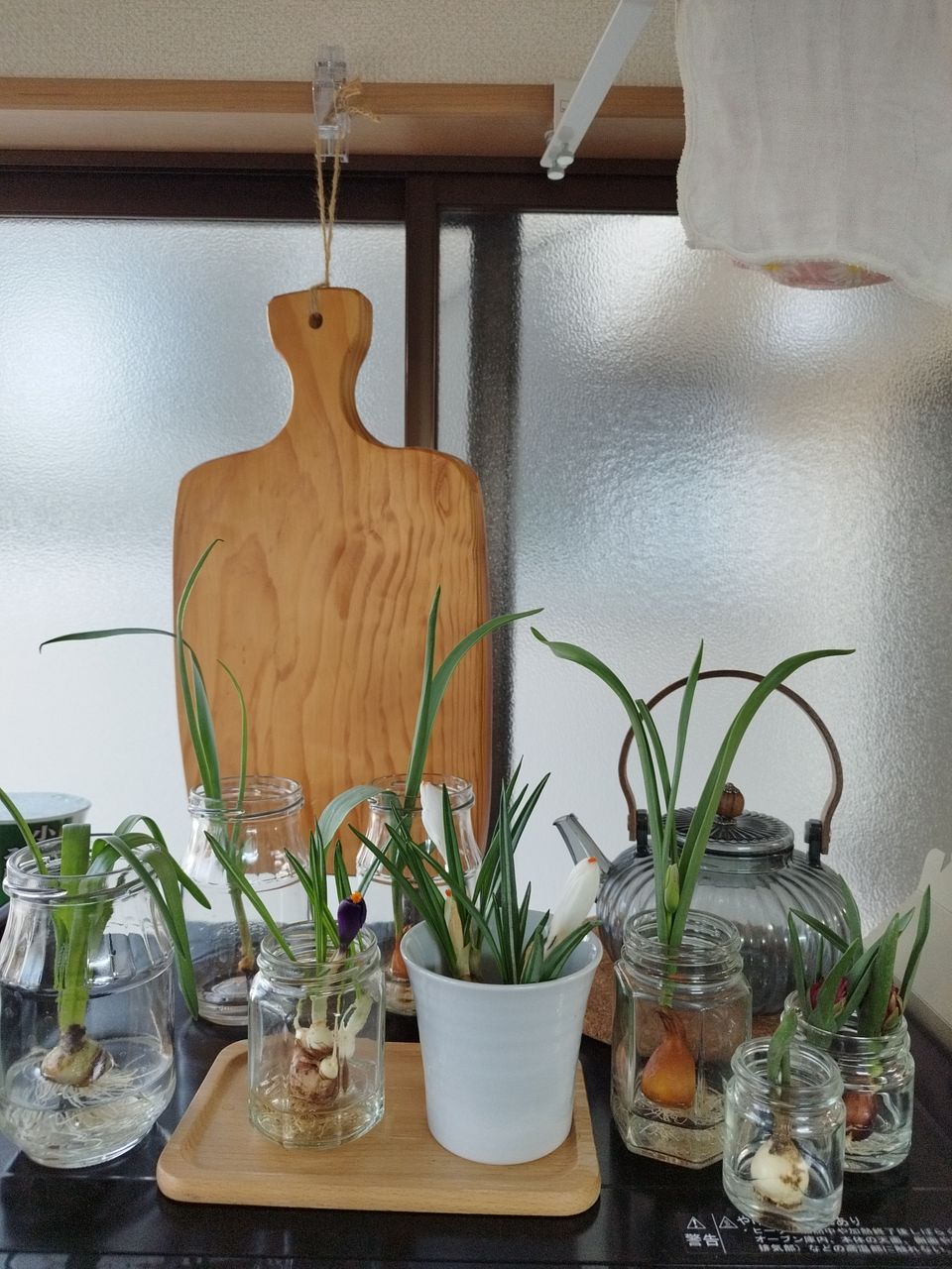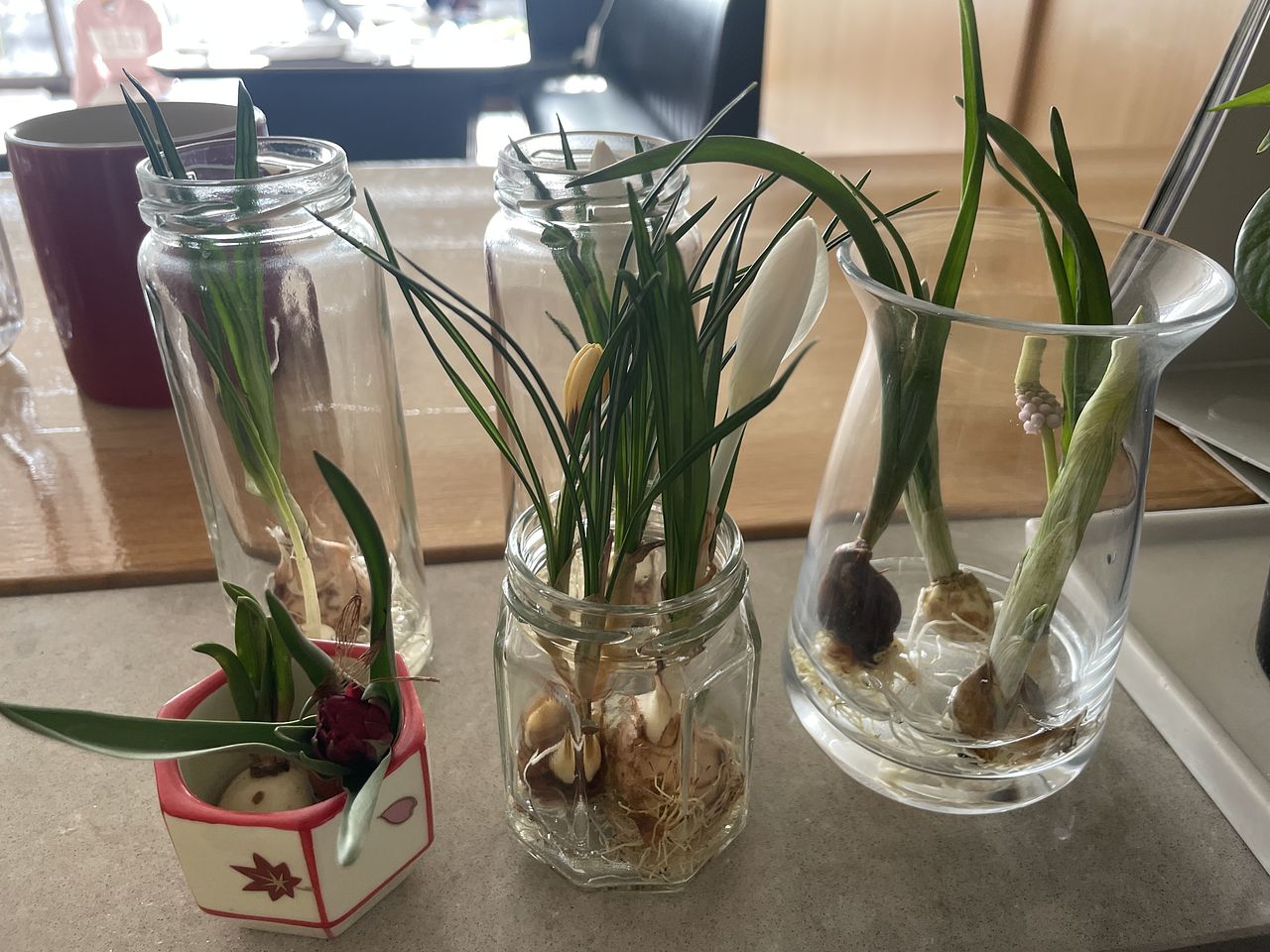 水仙、青いムスカリは早々に咲き始め、水仙は1週間ほど楽しめました。青ムスカリはきれいに咲き続けています。アイリスのような花が2つありましたが、花開く前に枯れてしまいました。その他、3個ほど根が腐ったり、葉が黄変してだめになりました。