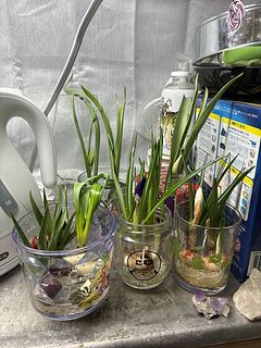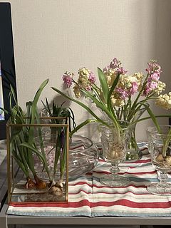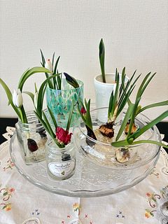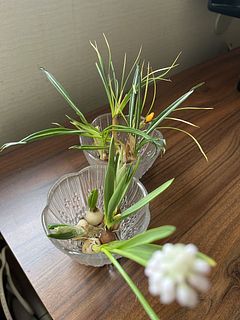 ムスカリ2、水仙1、その他①3、その他②2、その他③2の計10球入っていて、そのうちムスカリ、水仙はすぐに咲きました。その他は蕾のため何が咲くか楽しみです。ムスカリのひとつの葉が全体的に元気のない様子で届きましたが、翌日ペーパーで巻いて一晩おいたらリカバリーできました。