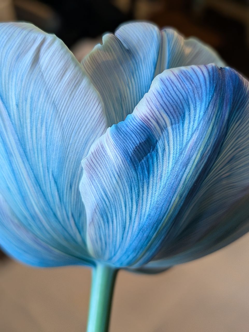 染料の影響により、葉の先端が青く染まっています。染めチューリップの特性であり、品質には問題ありません。花に水がしっかり届くよう、葉っぱは出来るだけ取り除いてしまいましょう。※写真は別の品種です