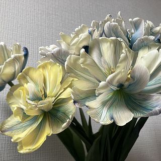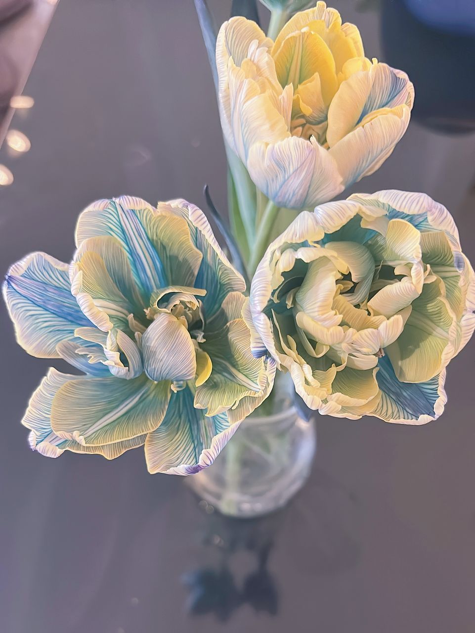 とてもきれいなチューリップがとどきました。 蕾で届いて暖房の効いた室内に入れたところ、開いてきました🥰 花の地色のクリーム色に花脈のブルーとパープルとが美しいです✨