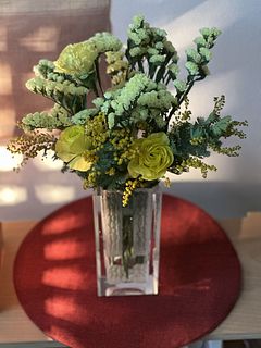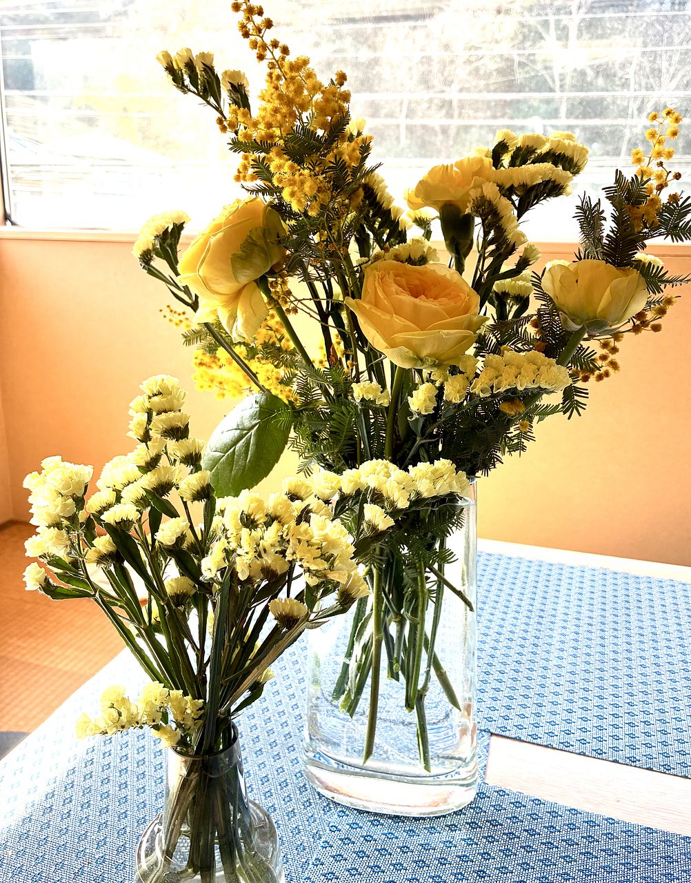 スターチスがかなり盛りだくさんでした、花びらの重なった八重咲きの薔薇が素敵、ミモザは色が濃くなった盛りがちょっと過ぎたもの、でも黄色のコントラストになって可愛い感じでした。