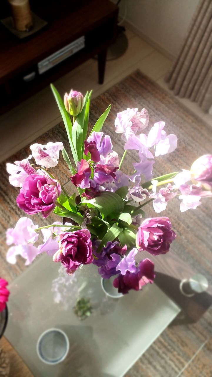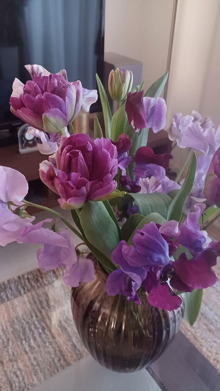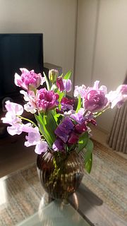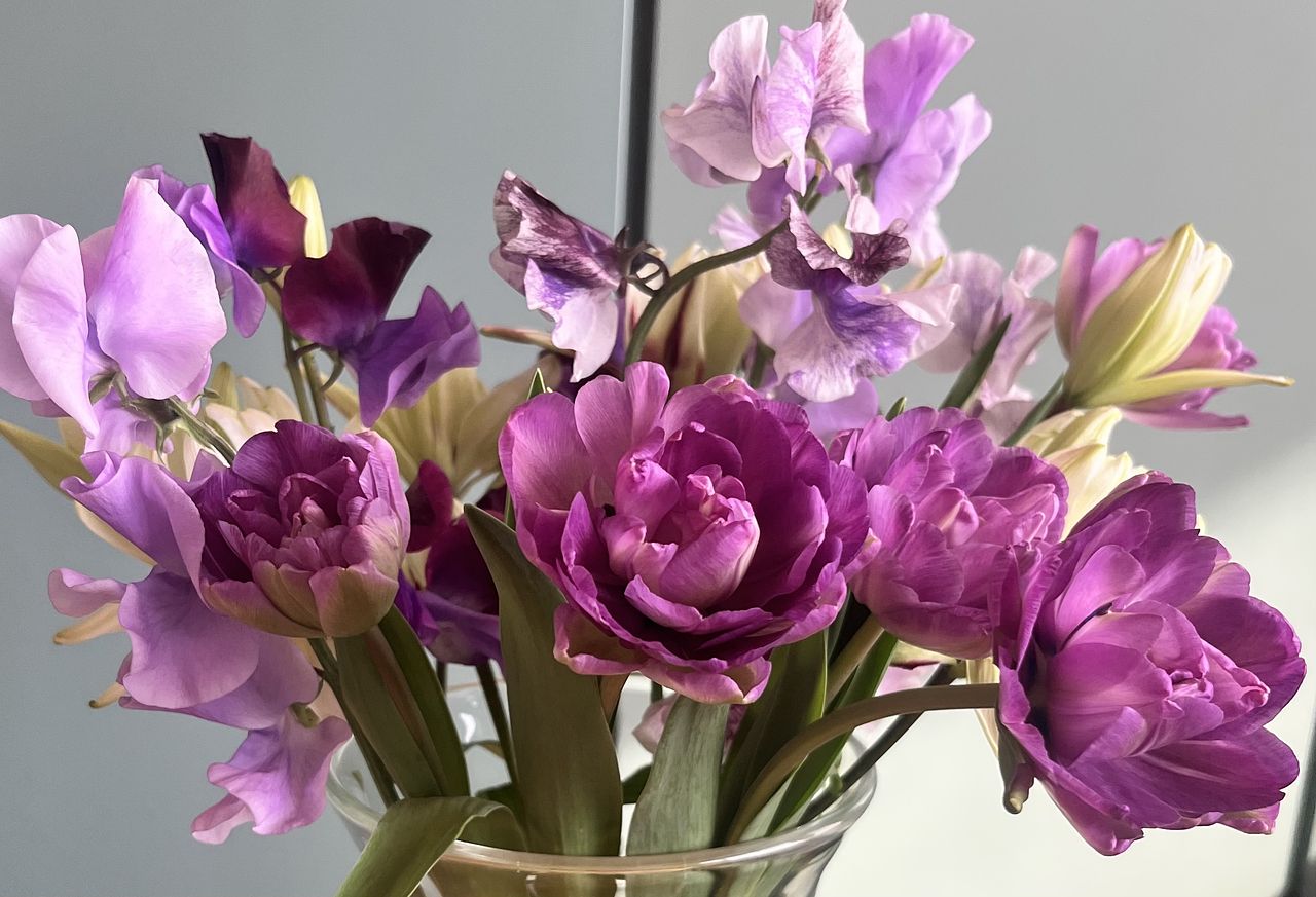 紫好きにはたまらないシックな色合いの チューリップと淡いスイトピーがいい感じです。 つぼみで届きましたが水あげ中に開き始めました。 見てると癒されます。