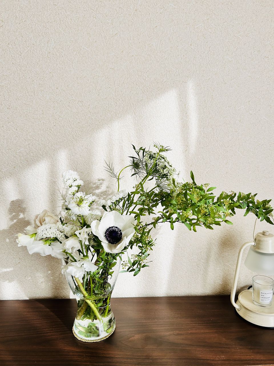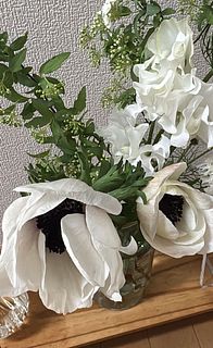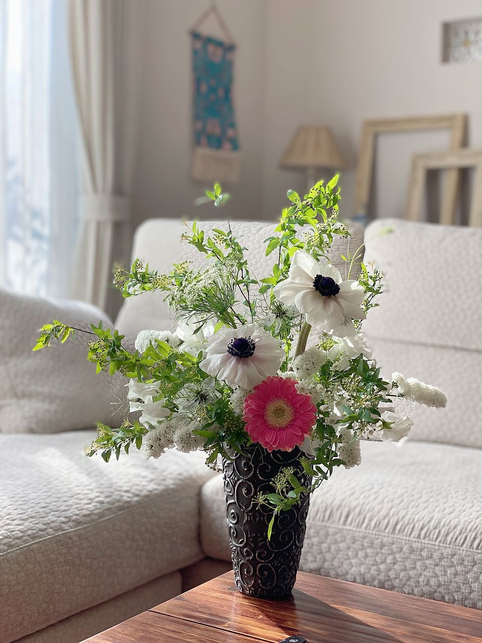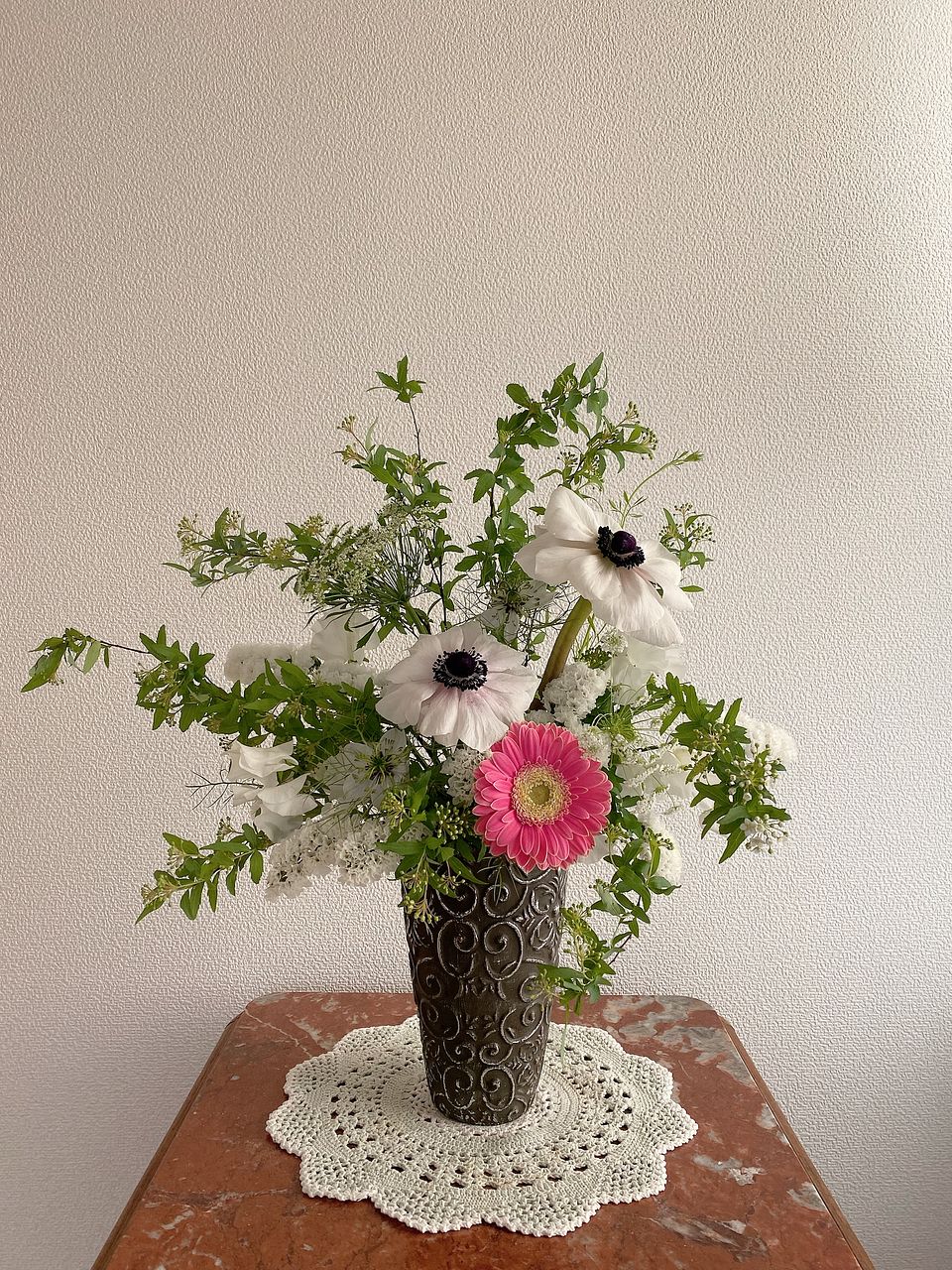 白いアネモネとお花たちにグリーンがすごくお洒落です🤍💚 (ピンクのガーベラが1輪前に別に買ったものがあったので、足しました💦) 寒い玄関に置いて、長く楽しみたいです💓