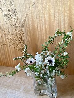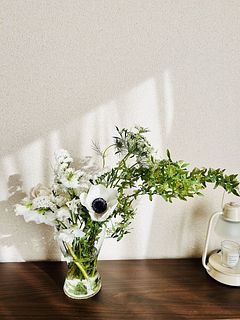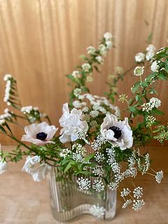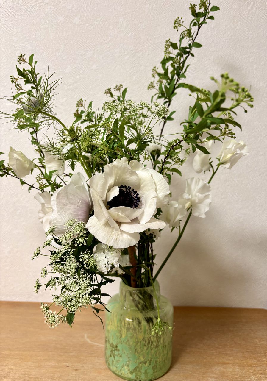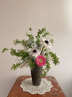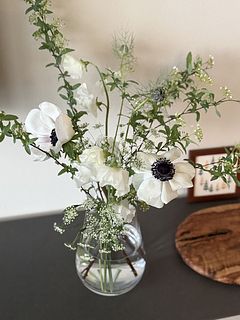 爽やかで可愛いブーケです。 アネモネの中心の色がとても綺麗です。 コデマリやニゲラ、レースフラワーの揺れる感じが素敵な組み合わせです。 コデマリとスターチスは別の花瓶にも分けて飾りました。
