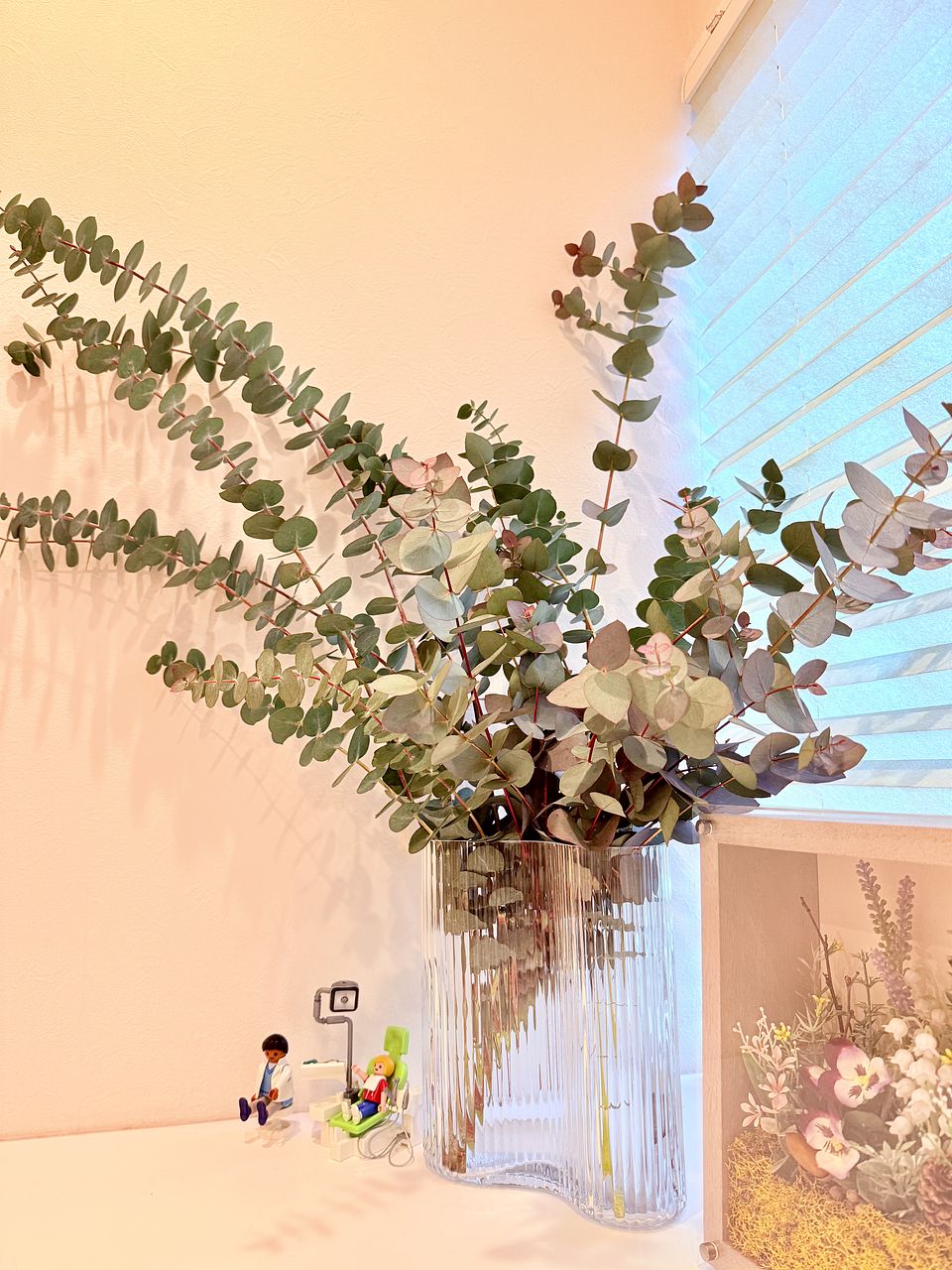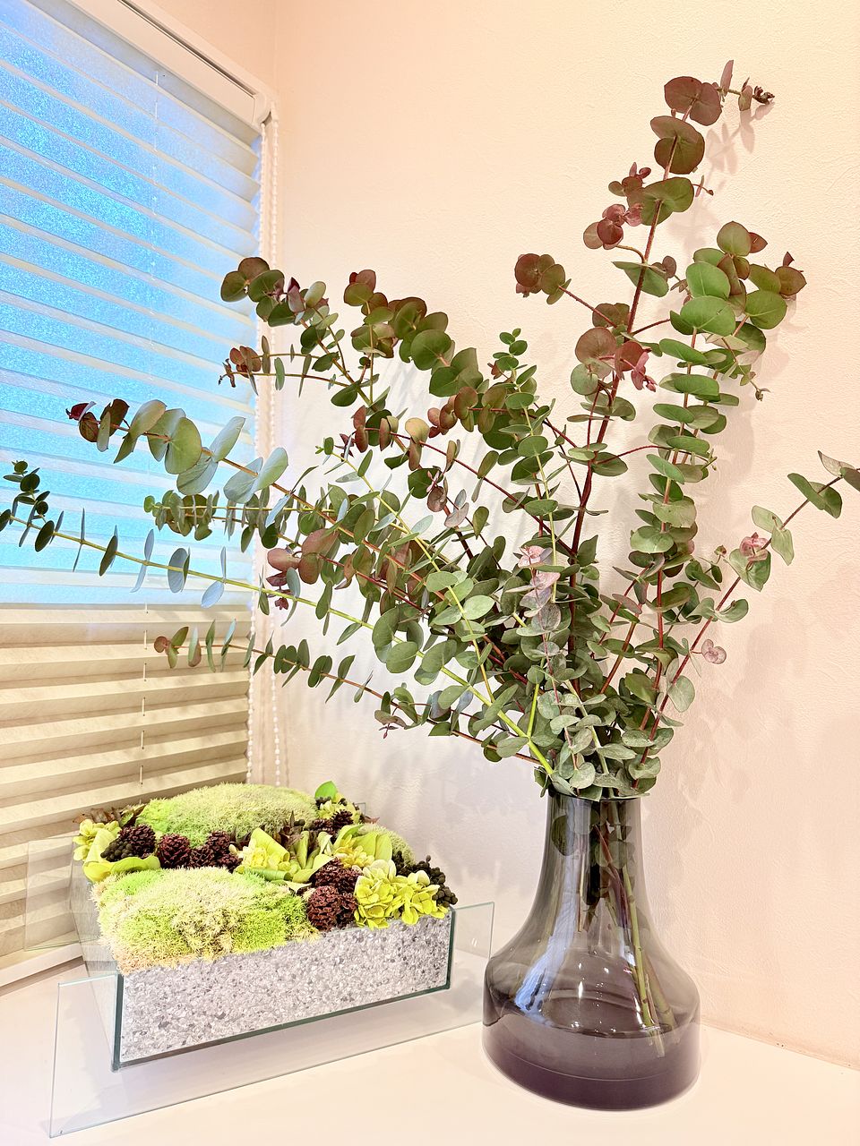 ユーカリは香りも良く、ボリュームもあってリビングを爽やかに彩ってくれて素晴らしい👍 ですが、一つ忘れていたことがペットの猫にはよくないということでした💦 猫が噛んだり舐めたりしては大変なので、残念ながらリビングから玄関に移動させて猫が出入りできないようにしました