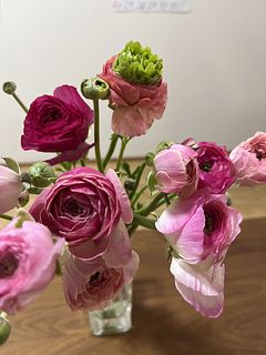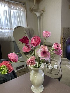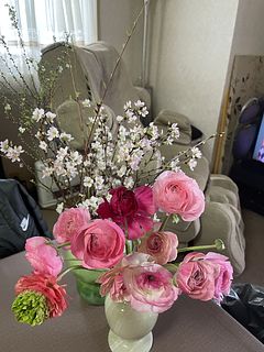 可愛いお色のラナンキュラス🩷 大好きなお花の1つです💕 前回購入の桜が満開で並べて飾っています🌸 長く楽しめるようにお手入れ頑張ります😊