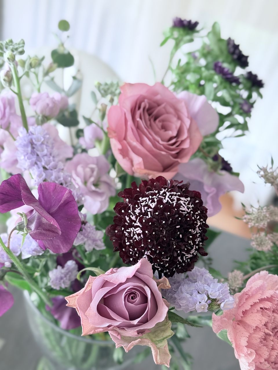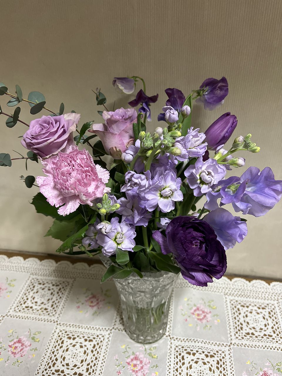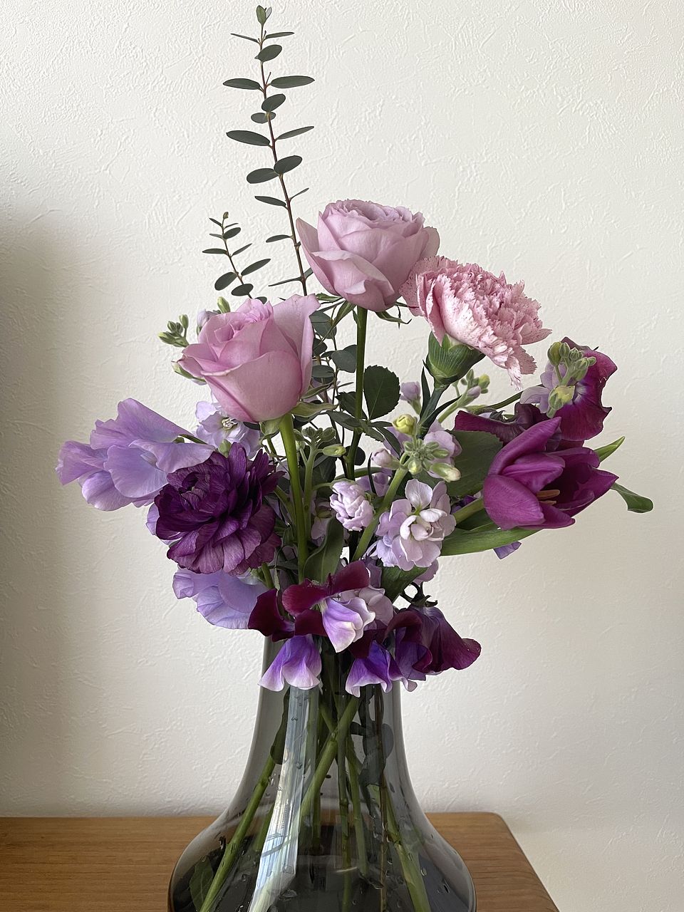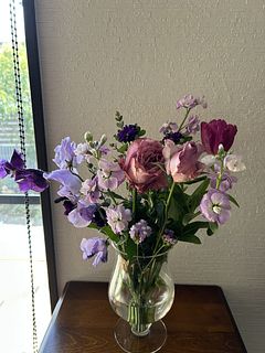 ばら、チューリップ、ストック、スイートピー、フリージア、スターチス、アスター、レースフラワー、ユーカリなど盛りだくさんでボリュームがありました。レースフラワーは今まで見たことがない色味のシックな感じでしたし、とても満足です。