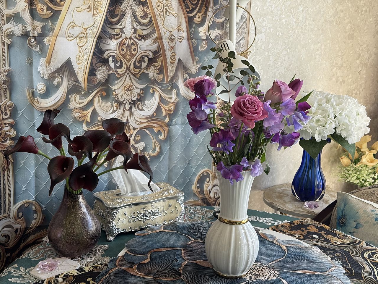 2月が誕生日なのでアメジスト色のブーケと栄養剤を購入💐 箱から出すとボリュームたっぷりで他のフラワーベースにも飾りました✨ 栄養剤も入れて華やかに咲いてます♪