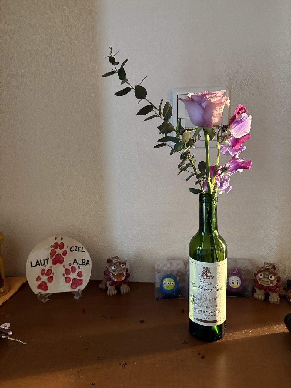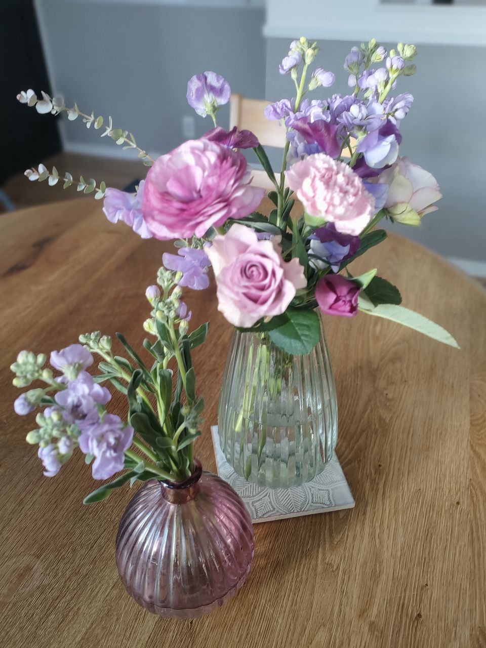 日曜日に到着し、今日で3日目ですが元気に咲いてくれています。花瓶を2つに分けてみました。毎月FLOWERさんのお花を購入していますが、前回届いた時のユーカリを仲間入りしさせました。
