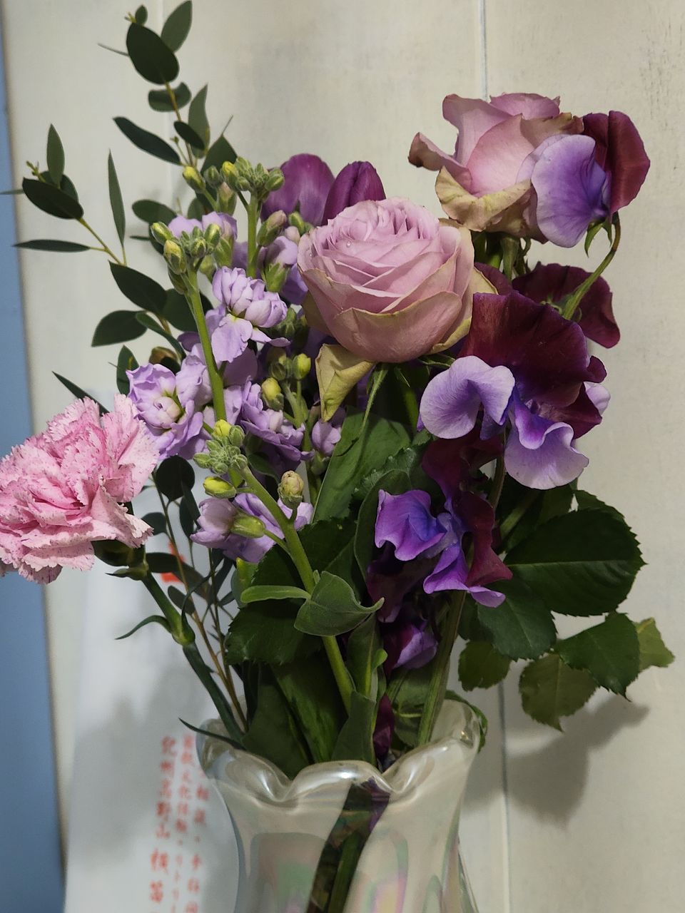 とても綺麗なアメジストカラーの花が届きました。 香りも良いです。 スィトピーが1つ取れていたのは、残念でした。