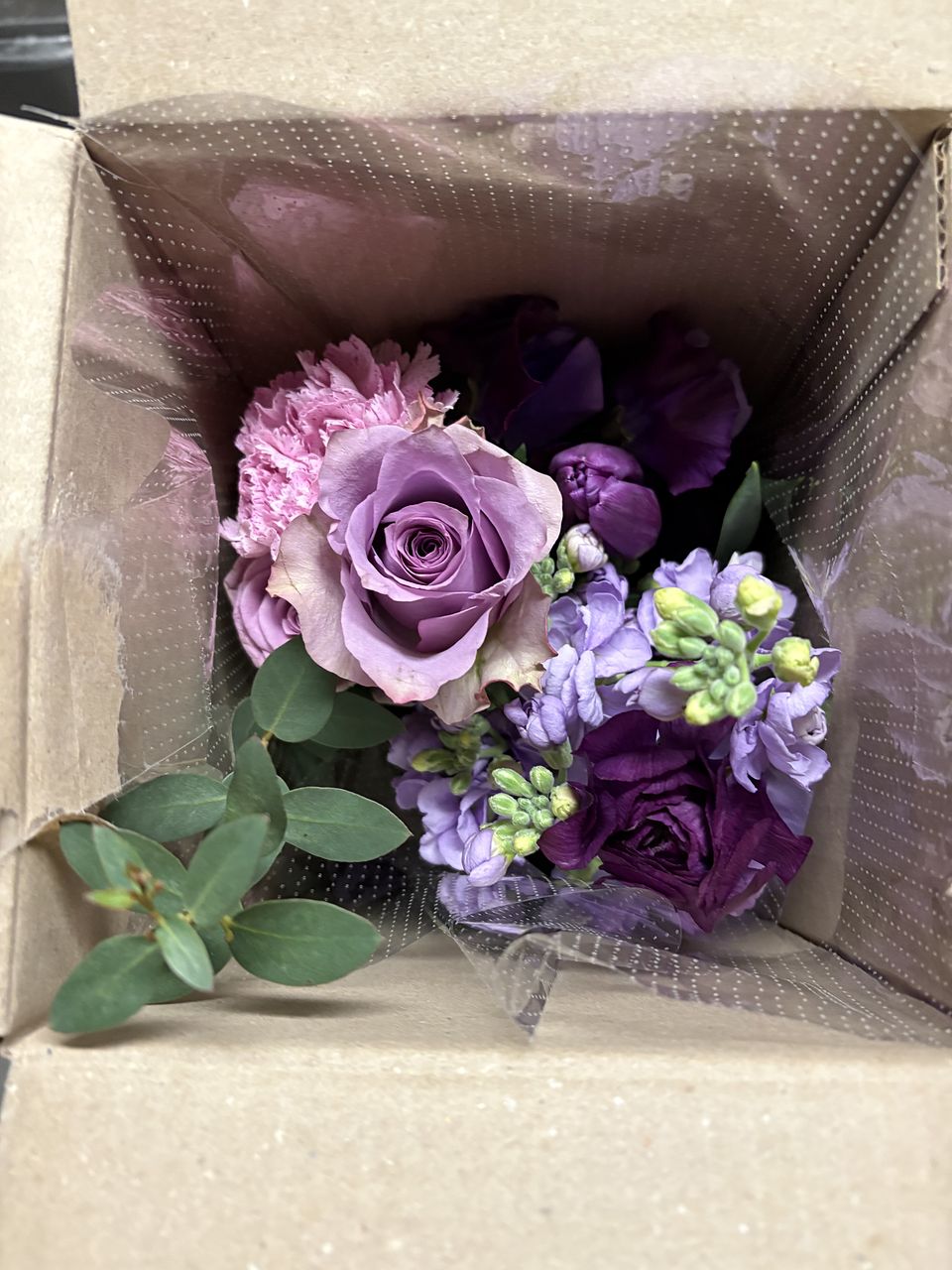 お花の種類によってパープルの濃淡の違いがあり、とても綺麗なアメジストブーケが届きました💐 分けて飾る位ボリュームのあるストックでした☺️