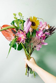 アンスリウム / グラジオラス / ガーベラ / レースフラワー / リューカデンドロン / モカラ / ミニパイナップル / パープルコンゴ / ヒエ / ひまわり / アルケミラモリス