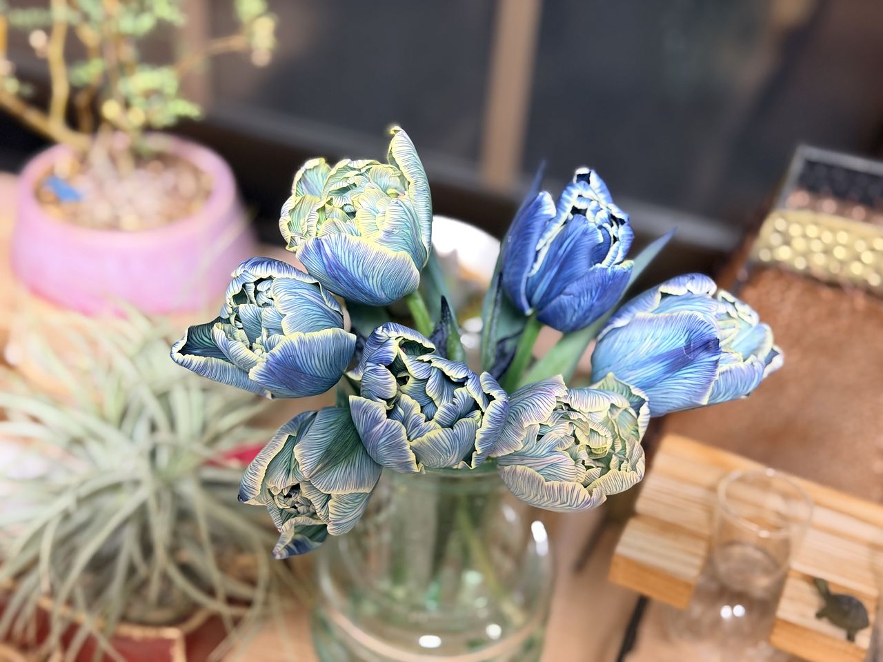 染料の影響により、葉の先端が青く染まっています。染めチューリップの特性であり、品質には問題ありません。花に水がしっかり届くよう、葉っぱは出来るだけ取り除いてしまいましょう。※写真は別の品種です