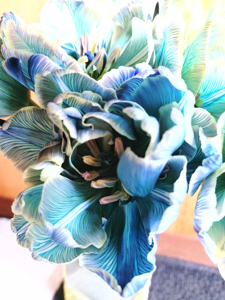 とてもきれいなチューリップがとどきました。 蕾で届いて暖房の効いた室内に入れたところ、開いてきました🥰 花の地色のクリーム色に花脈のブルーとパープルとが美しいです✨
