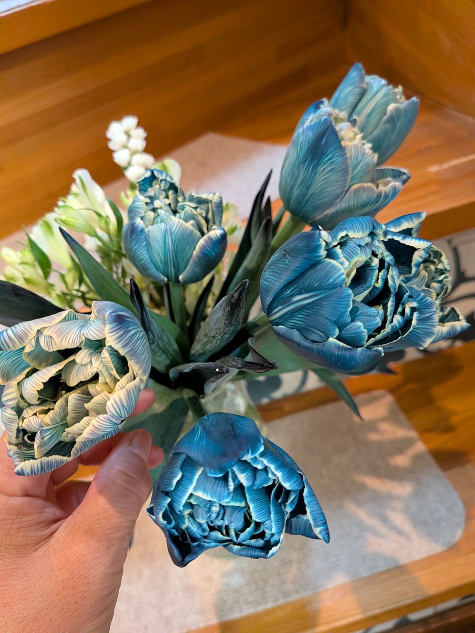 写真をみると地のチューリップはもっと白いチューリップかと思いましたが大分黄色く、染まり具合もいまいちで青と言うより黄色が勝っている感じで少し残念でした。また、初日でこの開き具合なのであんまり持たないかもと心配です。 とはいえこれはこういうものとして素敵ではあるので、最後まで愛でて楽しみたいと思います。ありがとうございました。