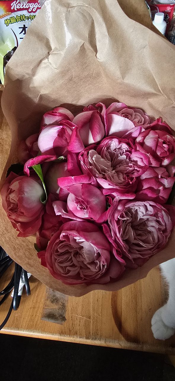 蕾は1本でしたが、届いて5日目で蕾以外は超満開 色はワイン薄いピンク、ホワイトまでグラデーションになってシックな感じです。香に癒されてます。 前日に届いた子の香もあり過去一の贅沢。