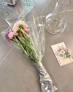 お花デビューです。花瓶も無いので試しにファゴット(20センチ高)を同時購入。初日は草を追加してボリュームを、花が開いてきたら丸く生けてみたり。ファゴットを使うと少なめ印象、裏まで丸くするにはあと5、6本欲しくなります。16センチ程度の花瓶に合いそうな量感でした