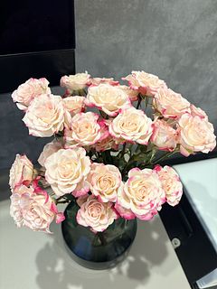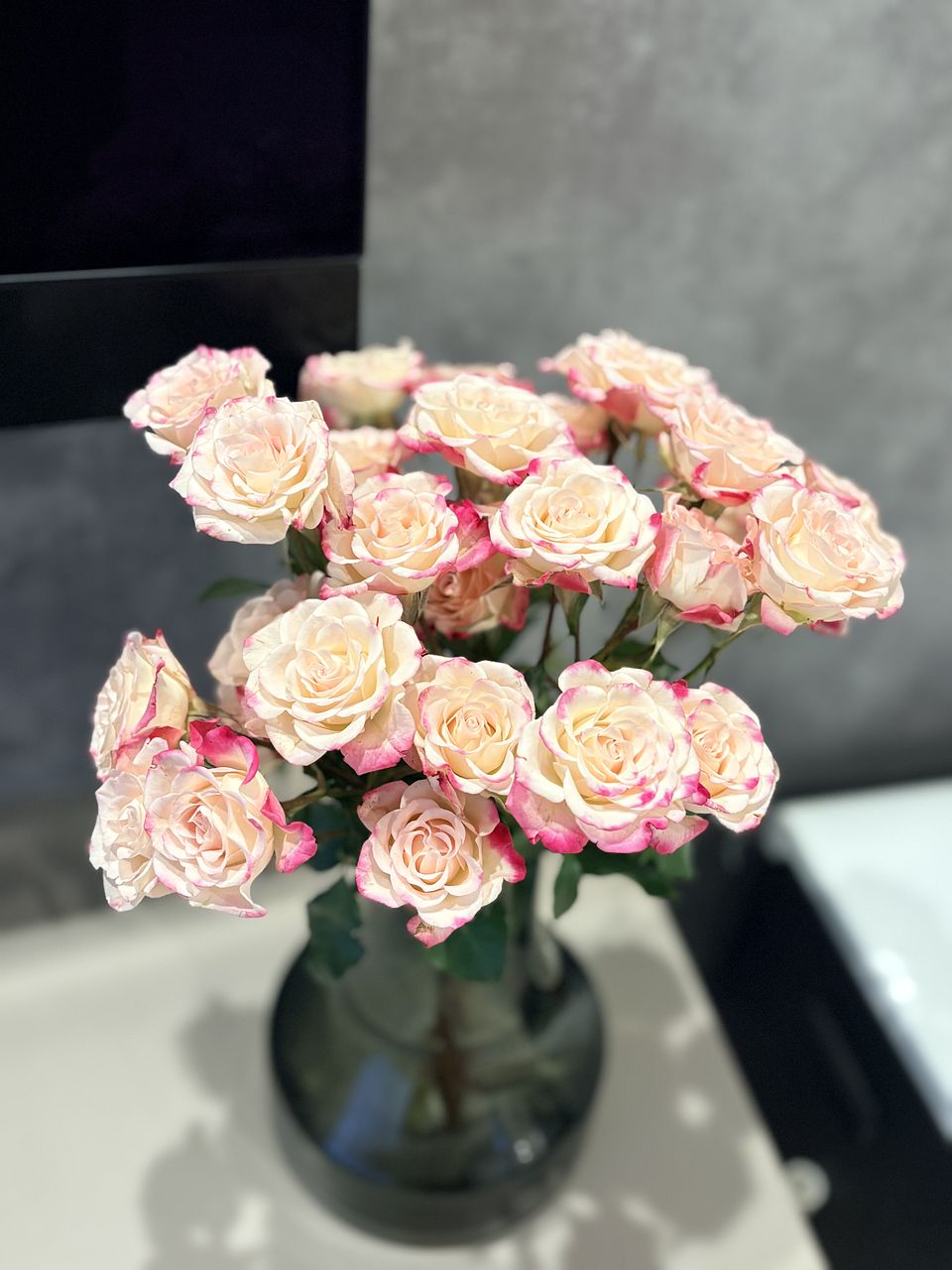 花びらの外側に濃いピンクが入る、まるでイチゴとミルクの混ざったような🍓甘いストロベリーミルクを思わせるバラ「リフレックス」。可愛らしさ抜群の姿は見ているだけでほっと優しい気分に。スプレーバラはラフにいけてもさまになるのが嬉しいポイント。ぜひお試しを。