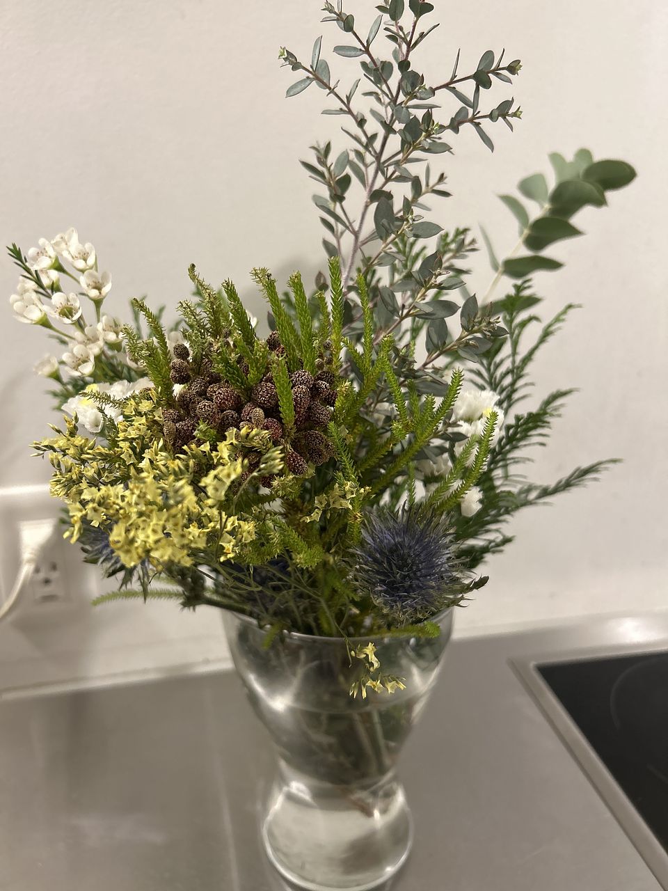 ヒバなど深い森の香りが楽しめるグリーンと、エリンジウムなど涼しげな花を合わせました。