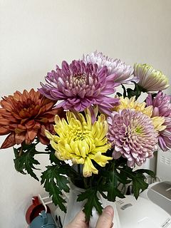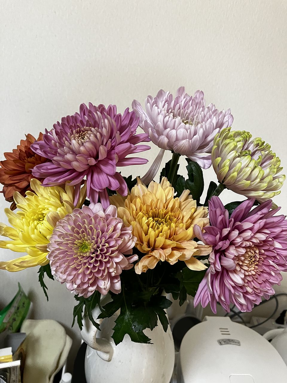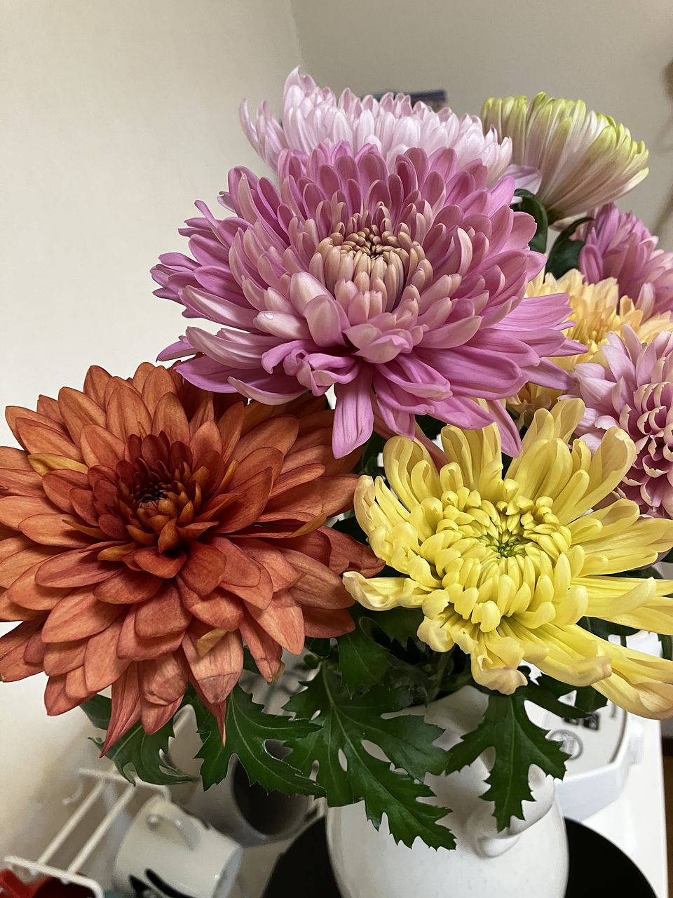 ピンク、白、黄色の大輪でとても綺麗でした。大ぶりのマムは長持ちしてお仏壇にも重宝しますので、年を通して継続的に販売して欲しいです。