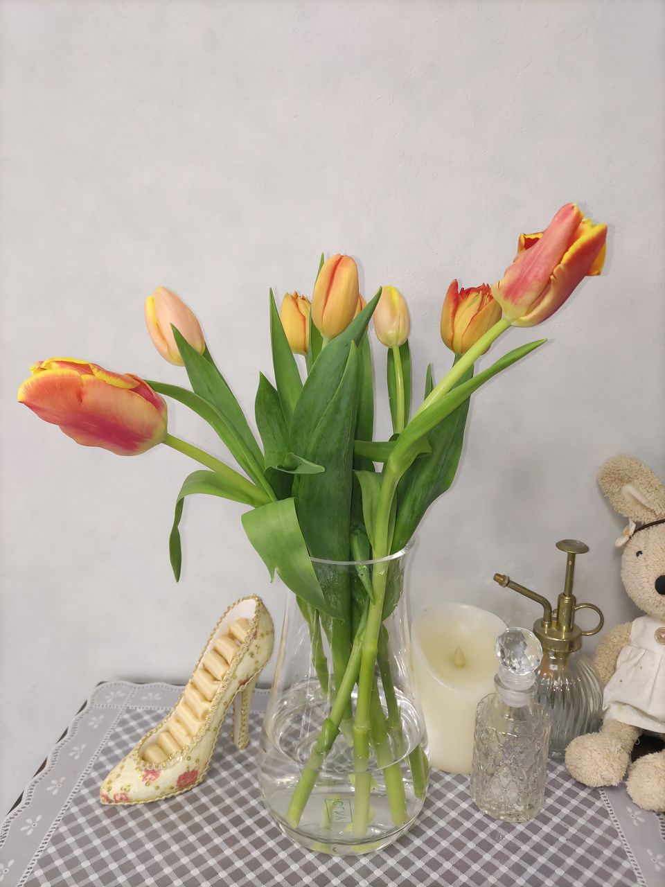 ごきげんなオレンジ色のチューリップを束ねました🤩