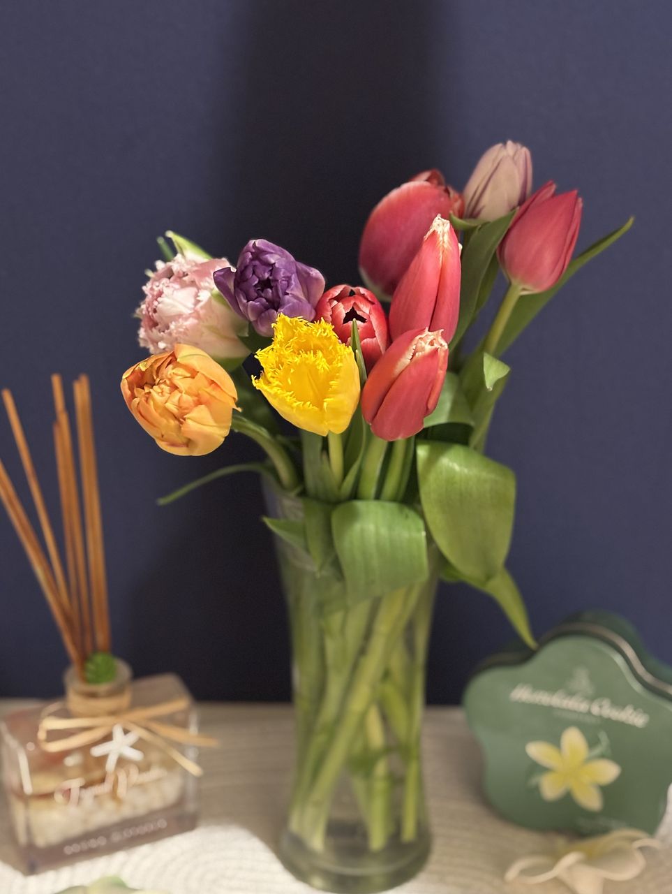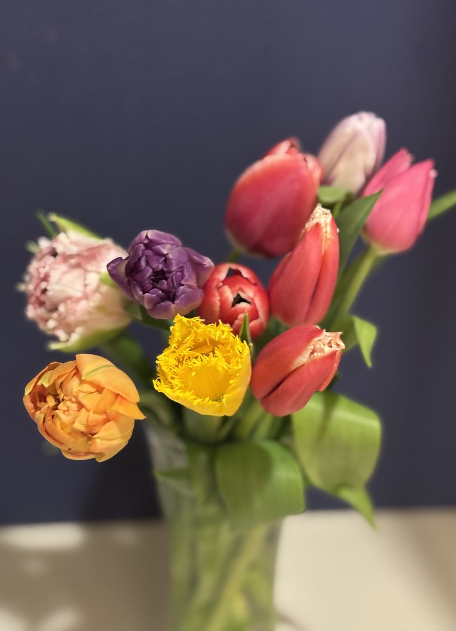 早くもお花の世界では春が訪れました🌷ショートサイズのチューリップだけを束ねて。