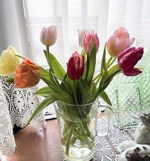 午前中に届いて、たっぷりの水で水揚げしてから、花瓶に活けました。八重咲、フリンジ咲など形も可愛く、色とりどりの10種類のチューリップ。どれもとても可愛くて元気です。特に、私は八重咲きのチューリップが好きなので、たくさん入っていてうれしいです。 丈短めですが、デスクに飾るのにちょうどよい長さです。 チューリップはこまめに水切りすると長くもつので、部屋が暖かくなりすぎないように気をつけながら長く楽しみたいと思います。