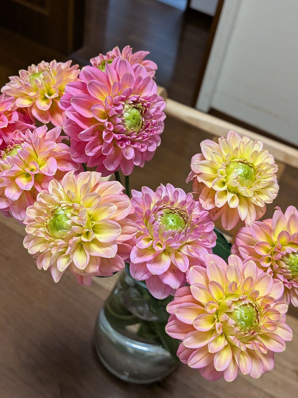 今回は小輪のダリア「ホットピンクオセロ」をたっぷり10本お届け。花径5cmほどの小輪のかわいらしいダリアです。春らしい柔らかいピンク色〜黄色のグラデーションが特徴の希少なダリア。ぜひお試しを🦩
