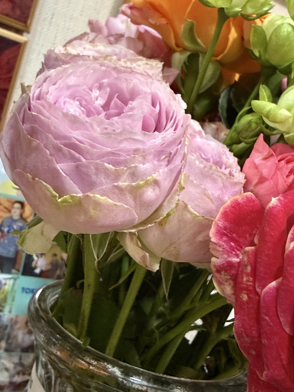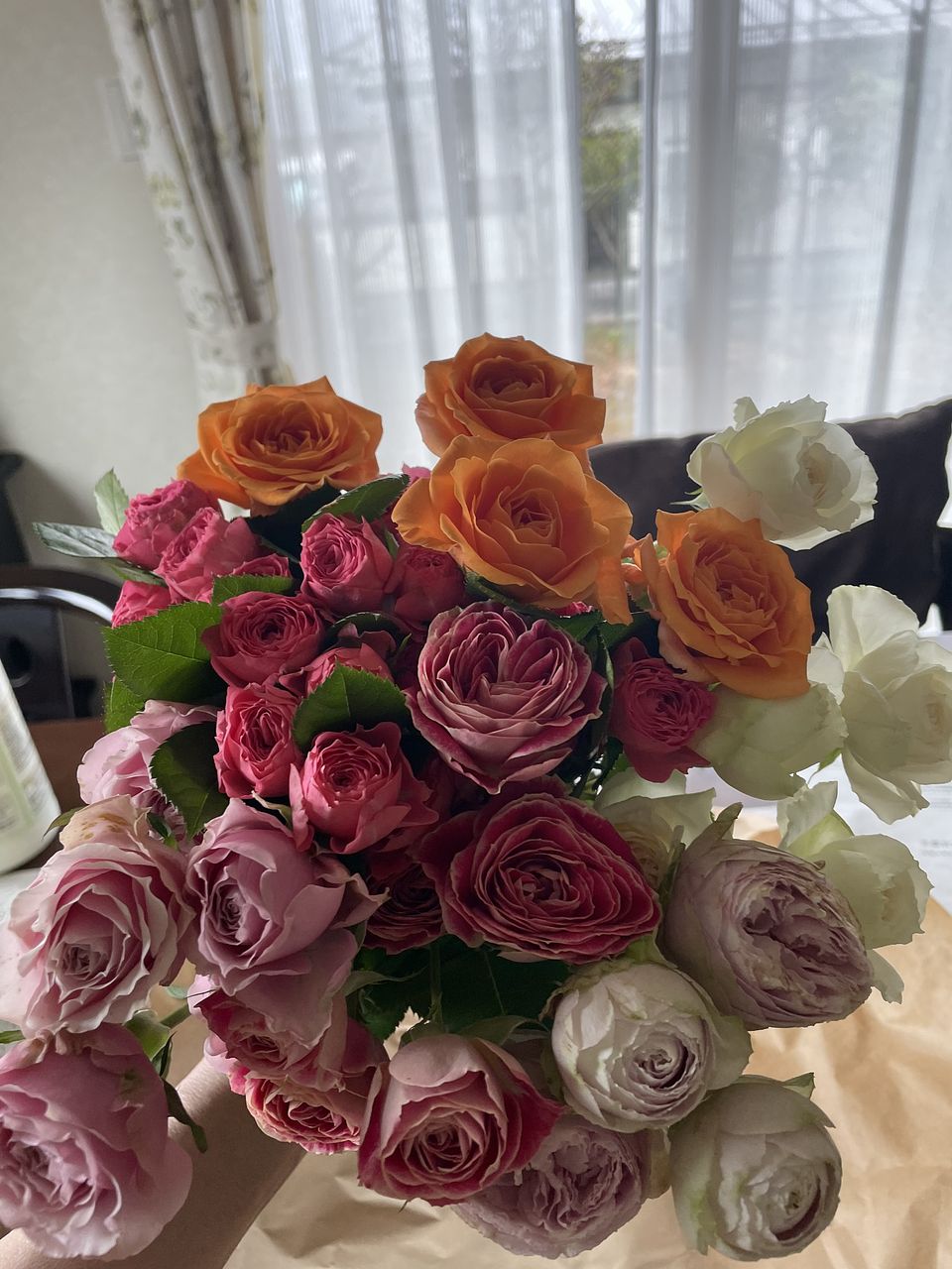 入り取り取りのバラが入っていて、普段は、ピンク系統のバラを選んでいましたが、今回は、オレンジ等ビタミンカラーも入っていて、とても明るいブーケを飾って楽しんでいます。