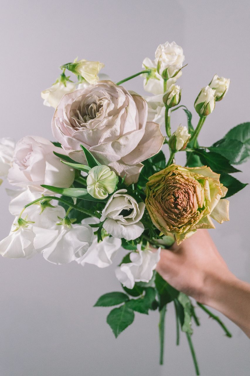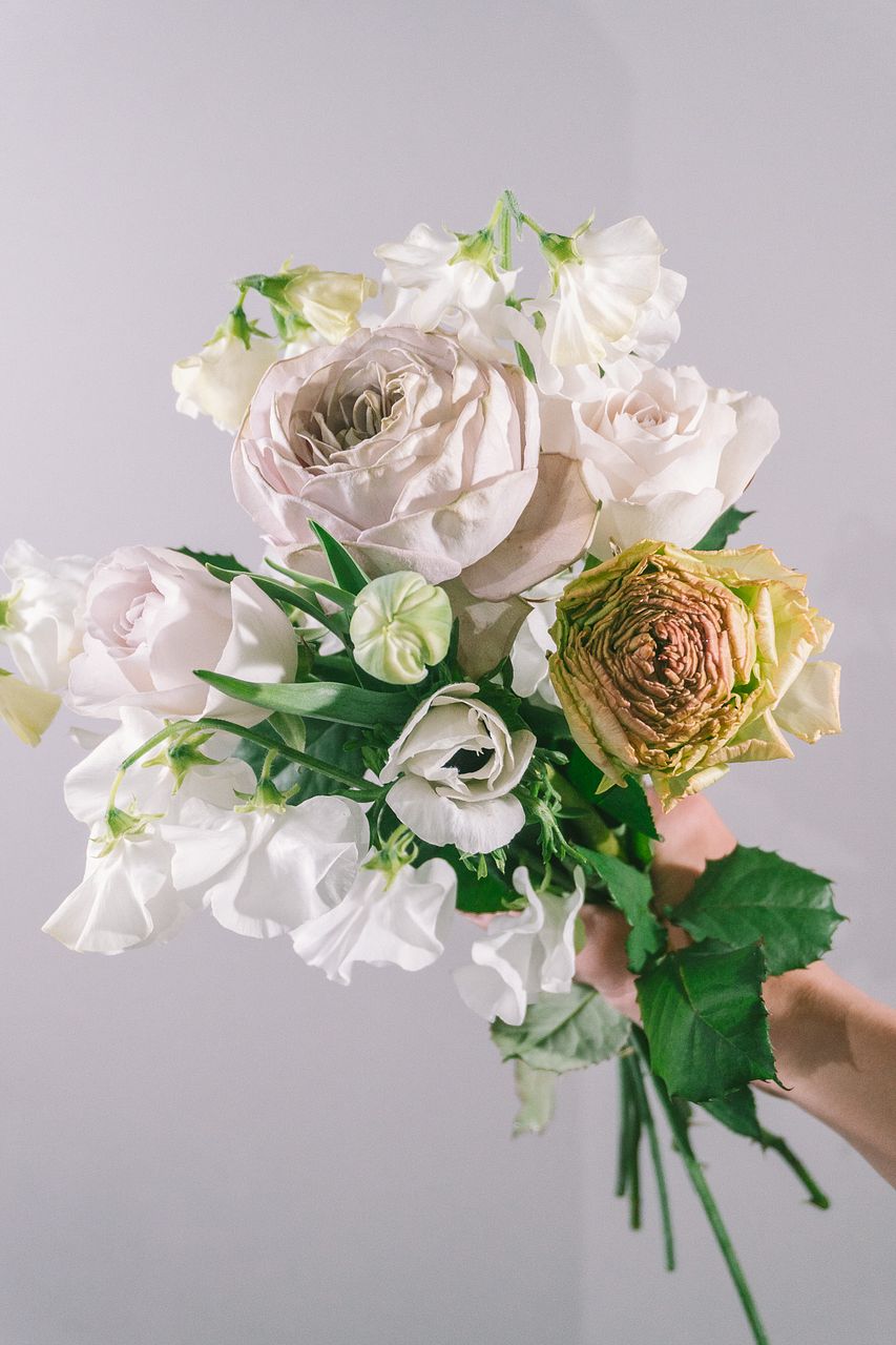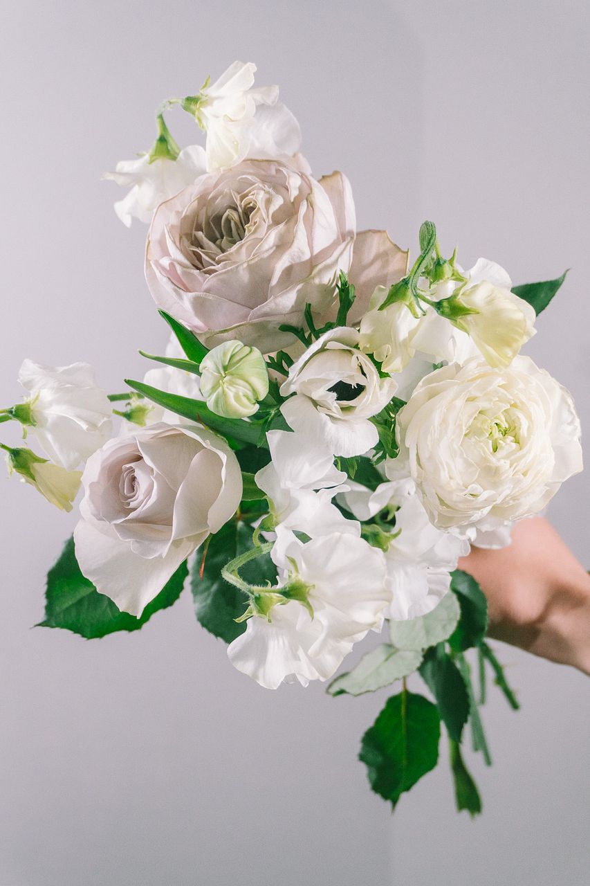 希少なグレーのバラを主役に、ホワイトカラーの「アネモネ」や「ラナンキュラス」「スイートピー」など春の花々を組み合わせたブーケ💐