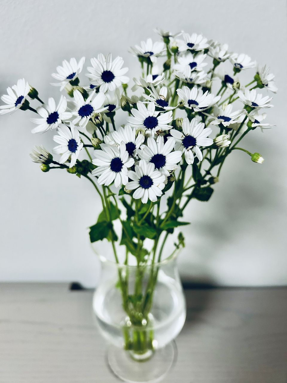 ホワイトの花びらに、ネイビーのコントラストがおしゃれ。花言葉は「喜び」。