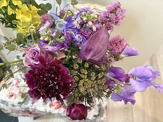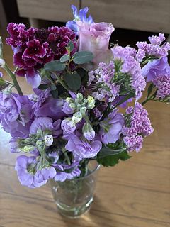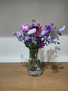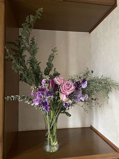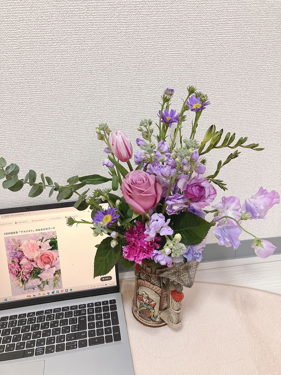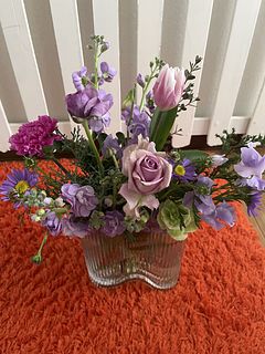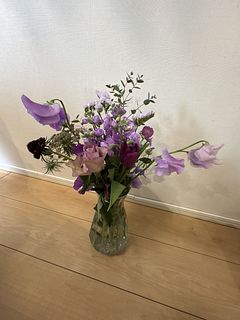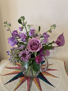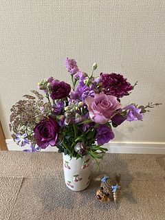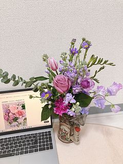 初回は出産を終え退院してきた娘とお孫ちゃんをFlowerさんのお花でとても華やかにお迎えしたことを鮮明に覚えています。今回は花器にあふれんばかりのアメジストでやっぱり私にピッタリ❣️