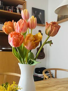 ごきげんなオレンジ色のチューリップを束ねました🤩