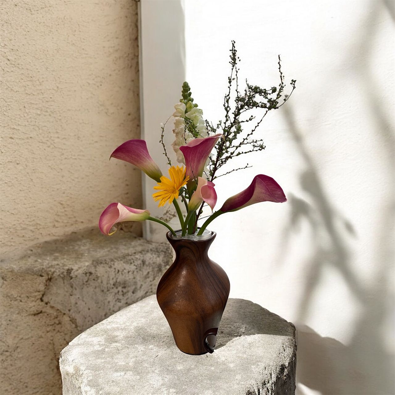 2週間前に届いたさくら色のマムがまだきれいでしたので、一緒に挿してみました。カラー独特の質感でピンクでもシックな雰囲気にまとまり、マムとも予想外にすてきでした🙌🏻💗