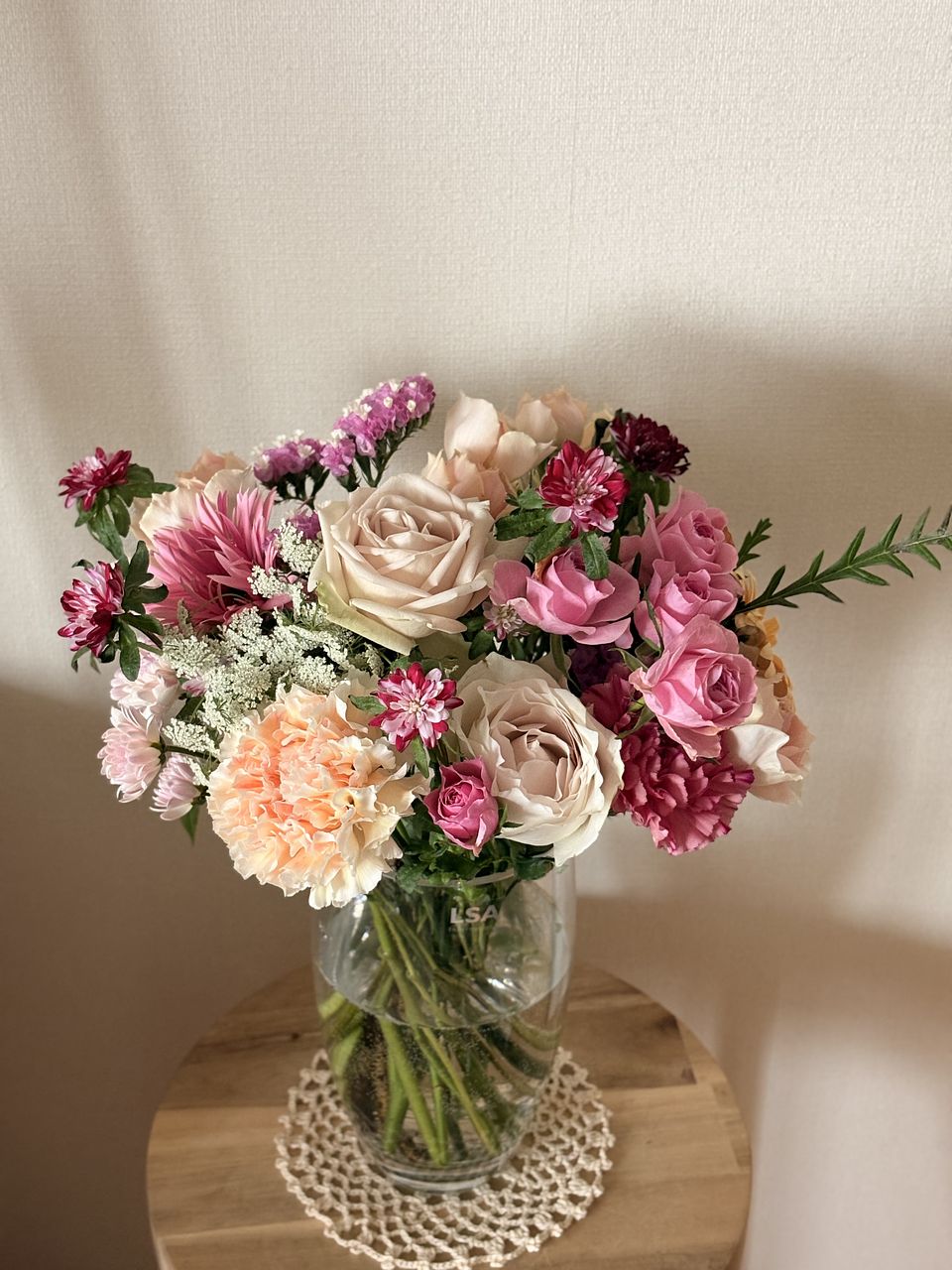異なるピンクの重なりが、甘さと華やかさのバランスを生み出す大人可愛いブーケです。